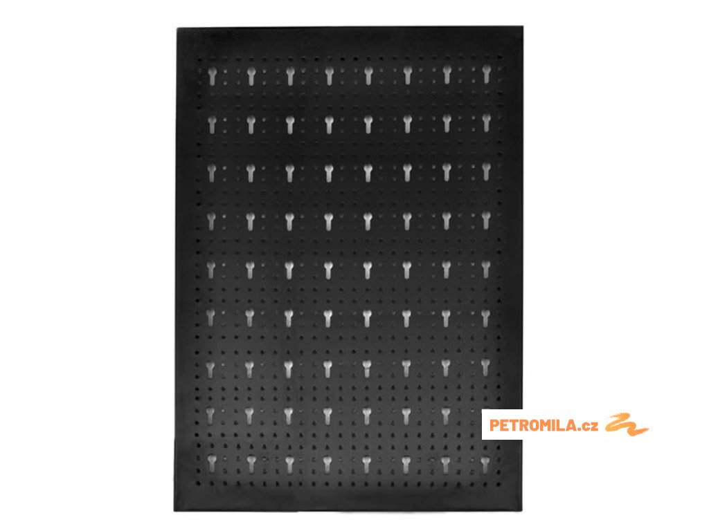 Široká kovová děrovaná deska je ideální pro vystavení nebo organizaci nářadí. Má předvrtané otvory (euro standard) a dodává se s 18 dvojitými háčky