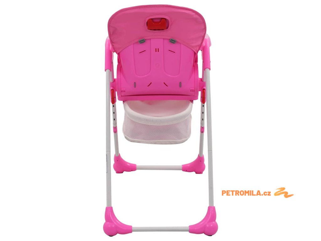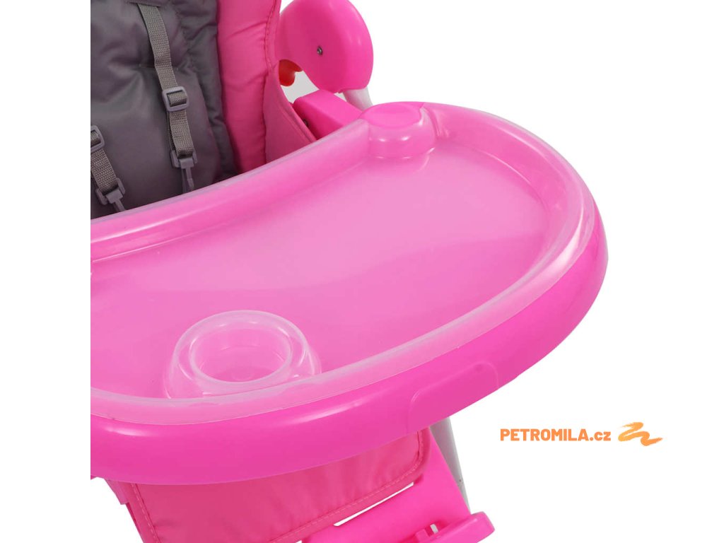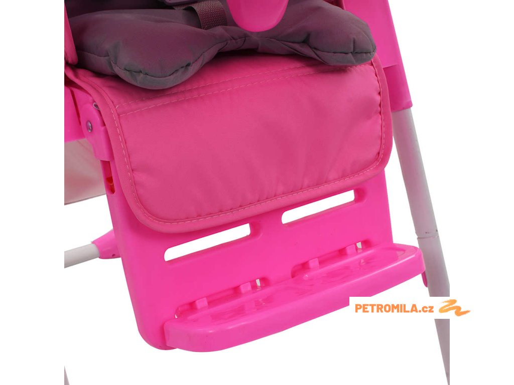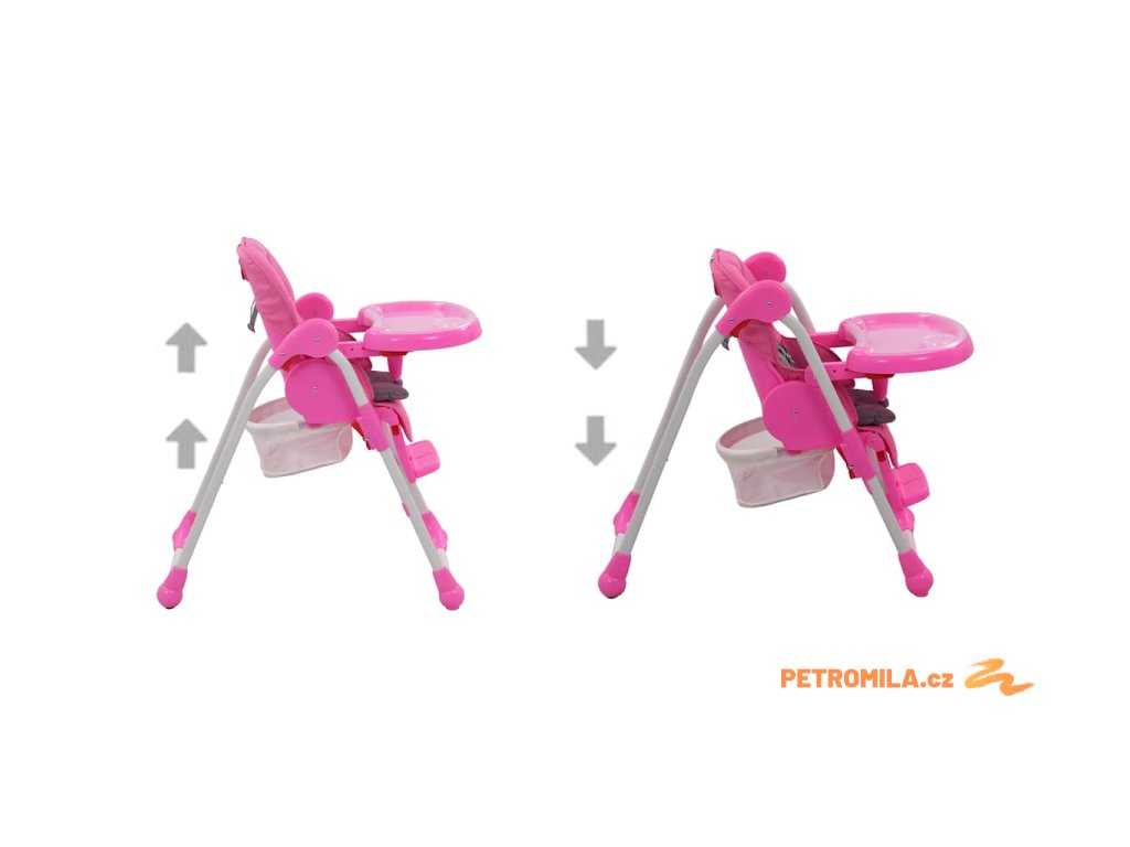 Má ocelový rám a prvky z odolného plastu pro dlouhotrvající pevnost a provozní životnost, takže vašemu dítěti poskytne spolehlivou oporu. Polstrované sedadlo s měkkým čalouněním a 5bodový bezpečnostní postroj se postarají o pohodlí a bezpečí vašeho nejmenší po celou dobu jídla. Židličku je možné naklopit do 3 různých poloh tak, aby dítě mělo za všech okolností dostatek komfortu. Upravit lze také její výšku a opěrku nohou, což rovněž přispívá k příjemnému posezení. Nasouvací stoleček je odjímatelný, aby se lépe čistil. Ve spodní části najdete úložný košík, kam si můžete ukládat různé potřeby pro děti, například hračku, plenku, ubrousky a další věci, které je dobré mít při ruce. Židlička je vzadu opatřena kolečky pro snadné přesouvání.