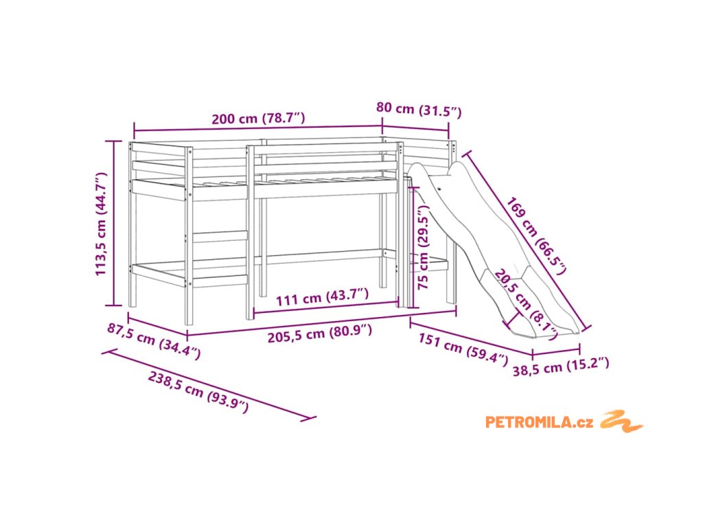 - Rozměry (bez skluzavky): 205,5 x 87,5 x 113,5 cm (D x Š x V)