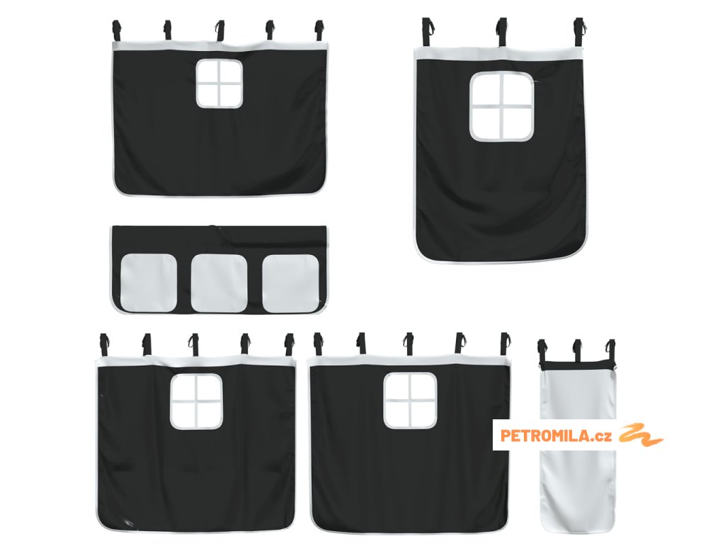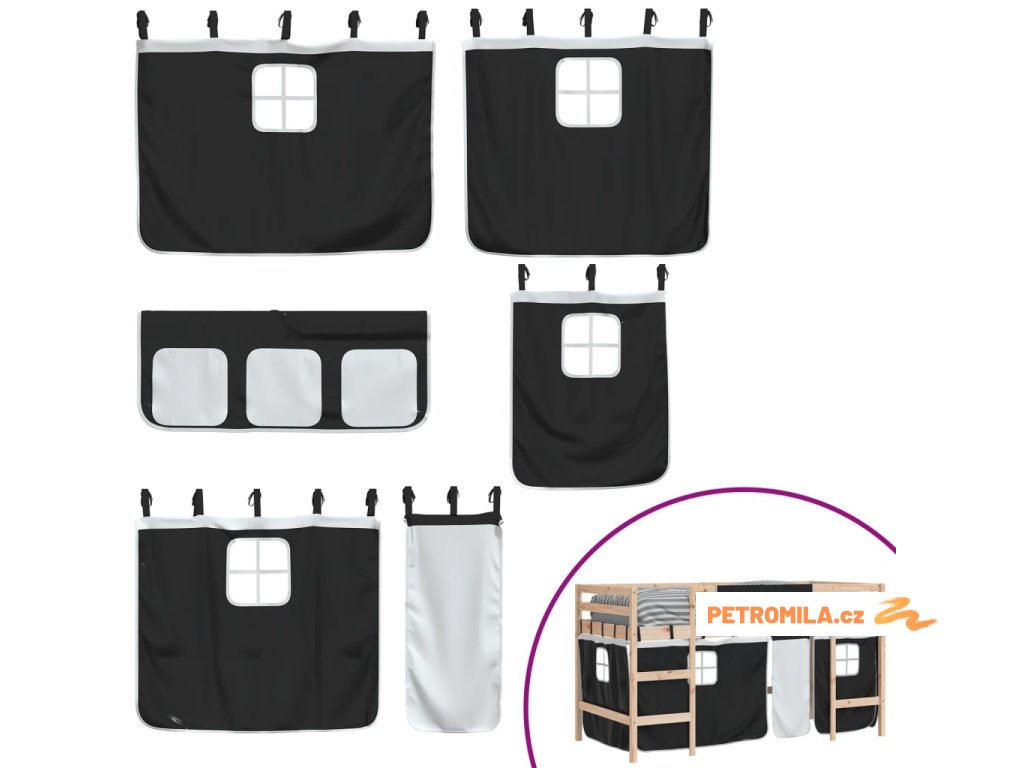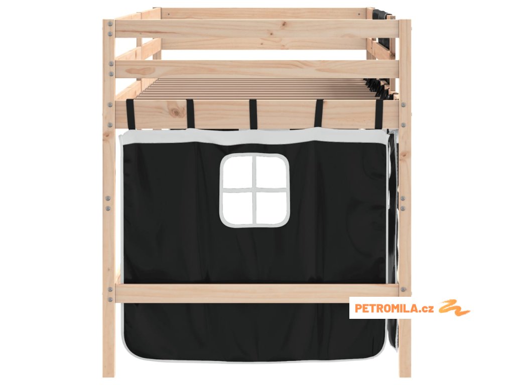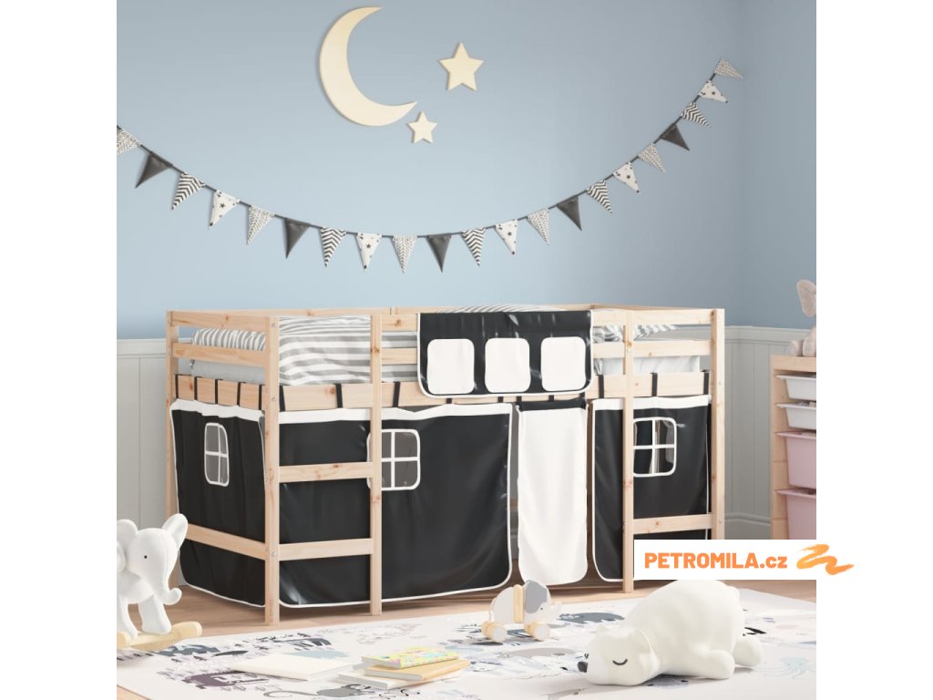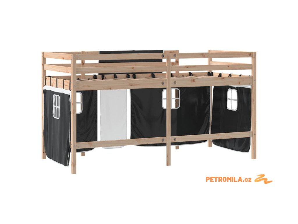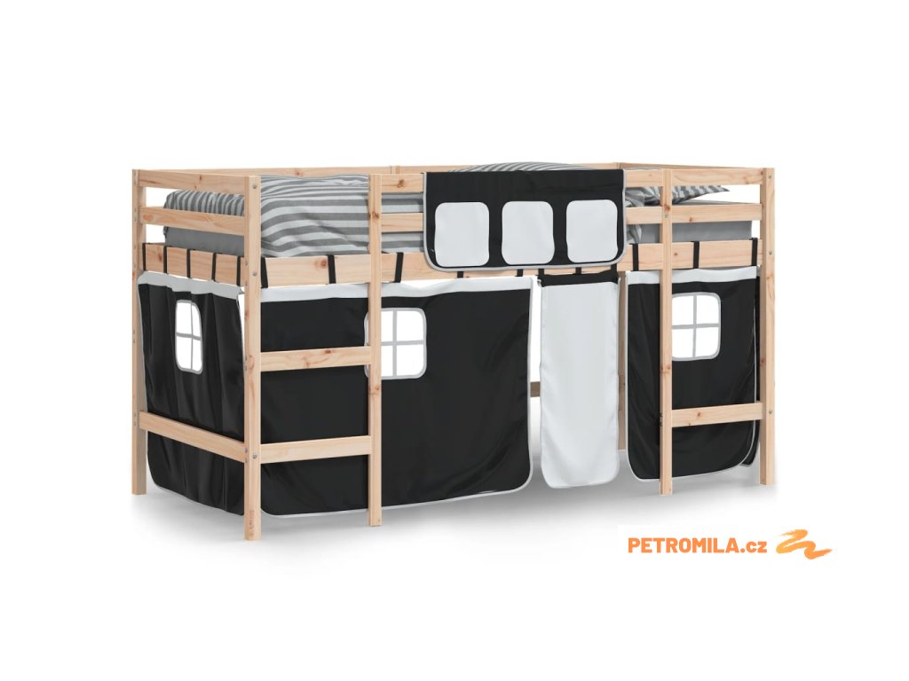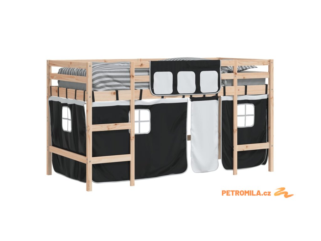 Dětská patrová postel se závěsy bílá a černá 80x200 cm borovice