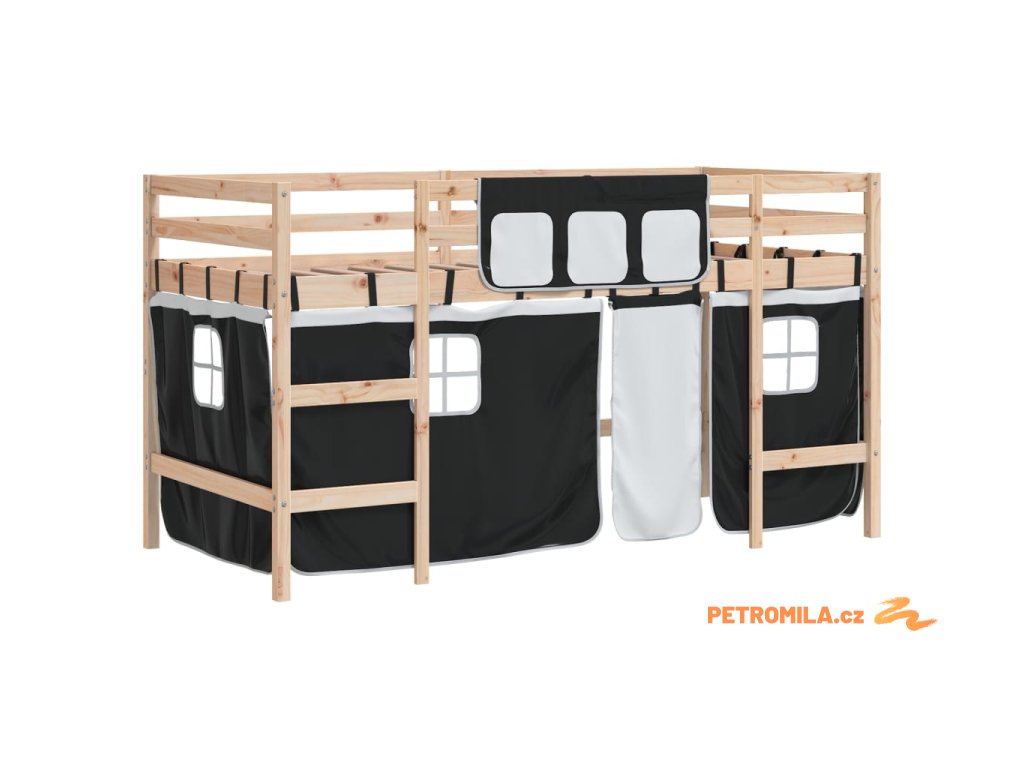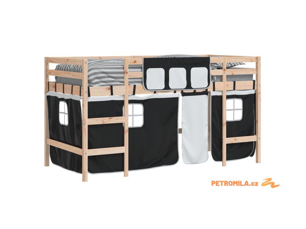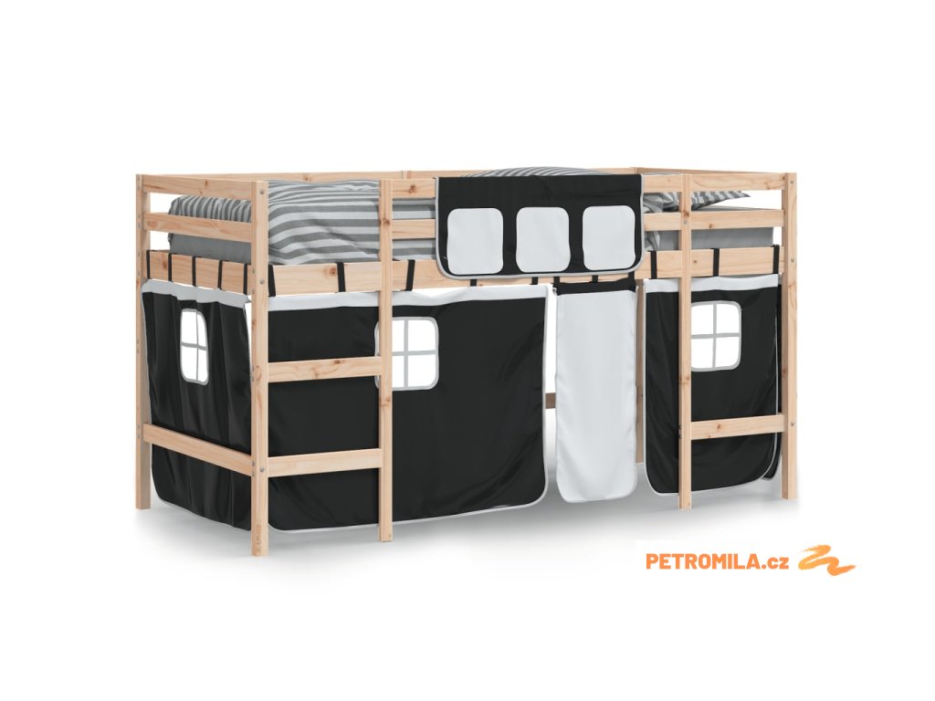 Dětská patrová postel se závěsy bílá a černá 90x200 cm borovice