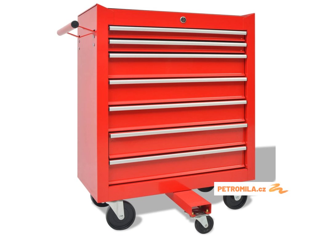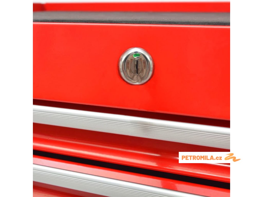 Vozík je vyrobený z vysoce kvalitní oceli a má robustní a odolnou konstrukci. Všech 7 zásuvek je možné současně zamknout integrovaným zámkem a zabránit tak nechtěnému otevírání zásuvek při pohybu vozíku. Robustní horní deska vozíku s nástroji je skvělým místem pro odkládání často používaných nástrojů, kde je budete mít po ruce. Vozík má čtyři otočná kolečka, z nichž dvě jsou opatřena brzdami, a prodlužovací tyč s opěrným kolečkem, vpředu, a proto lze s vozíkem snadno manipulovat. K tlačení vozíku slouží také pohodlná boční rukojeť.