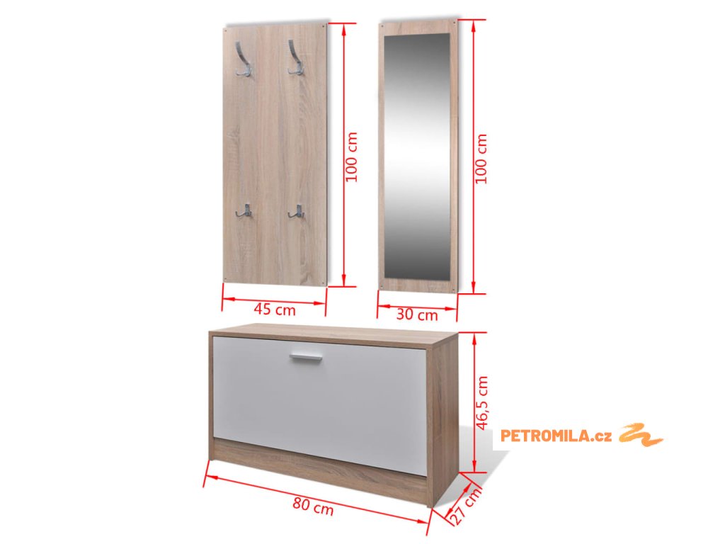 Ve stylově designovaném botníku je velká přihrádka se střední přepážkou, do které si snadno zorganizujete svou obuv, takže už nikdy nezakopnete o boty rozházené po podlaze. Věšák na kabáty je vybavený 4 robustními kovovými háčky na kabáty. Zrcadlo je dostatečně velké, abyste se mohli před odchodem z domu dobře upravit.