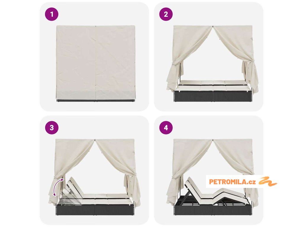 - Součásti: S vybavením se střechou a osmi závěsy, tahle souprava skvěle slouží pro soukromí. Dva sedací polštáře s odnímatelnými potahy zvyšují komfort a dělají relaxaci příjemnější. Lehátko má elegantní design s možnostmi nastavení, což vám ulehčí robotu.