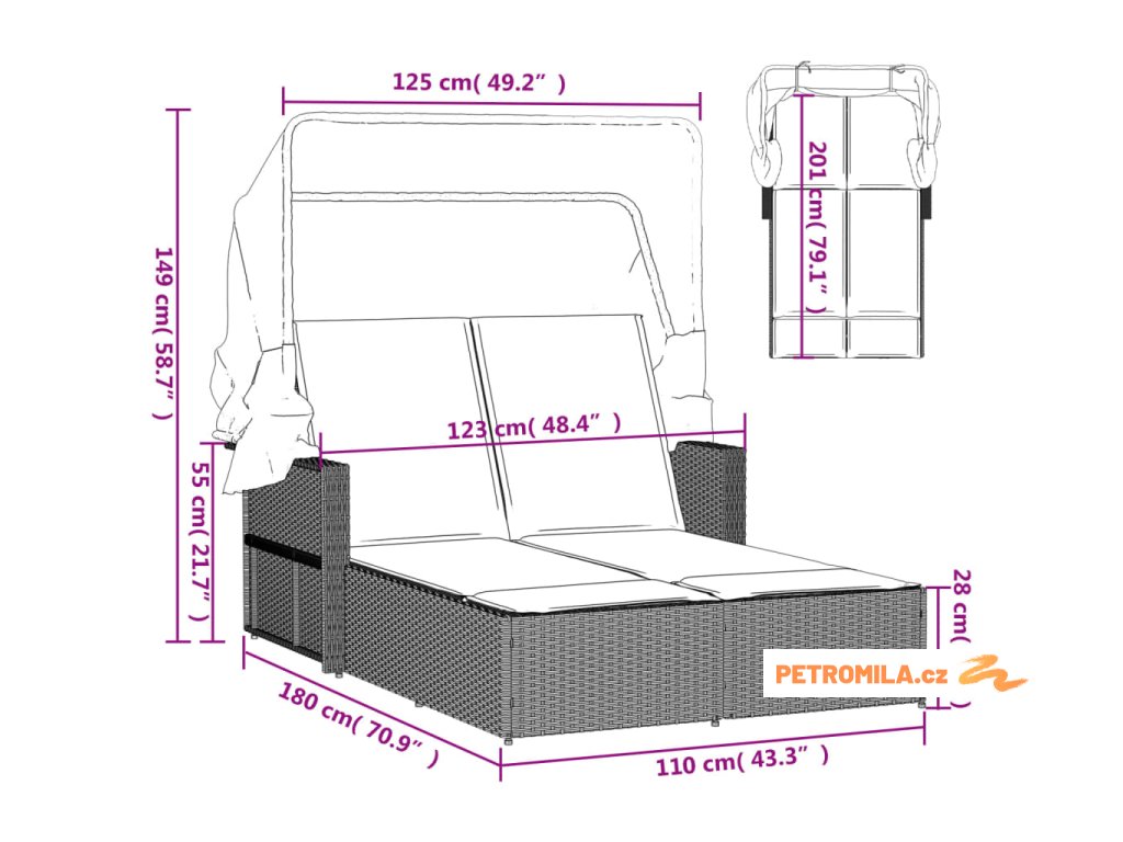 - Rozměry bez stříšky: 110 x 180/201 x 95 cm (Š x H x V)