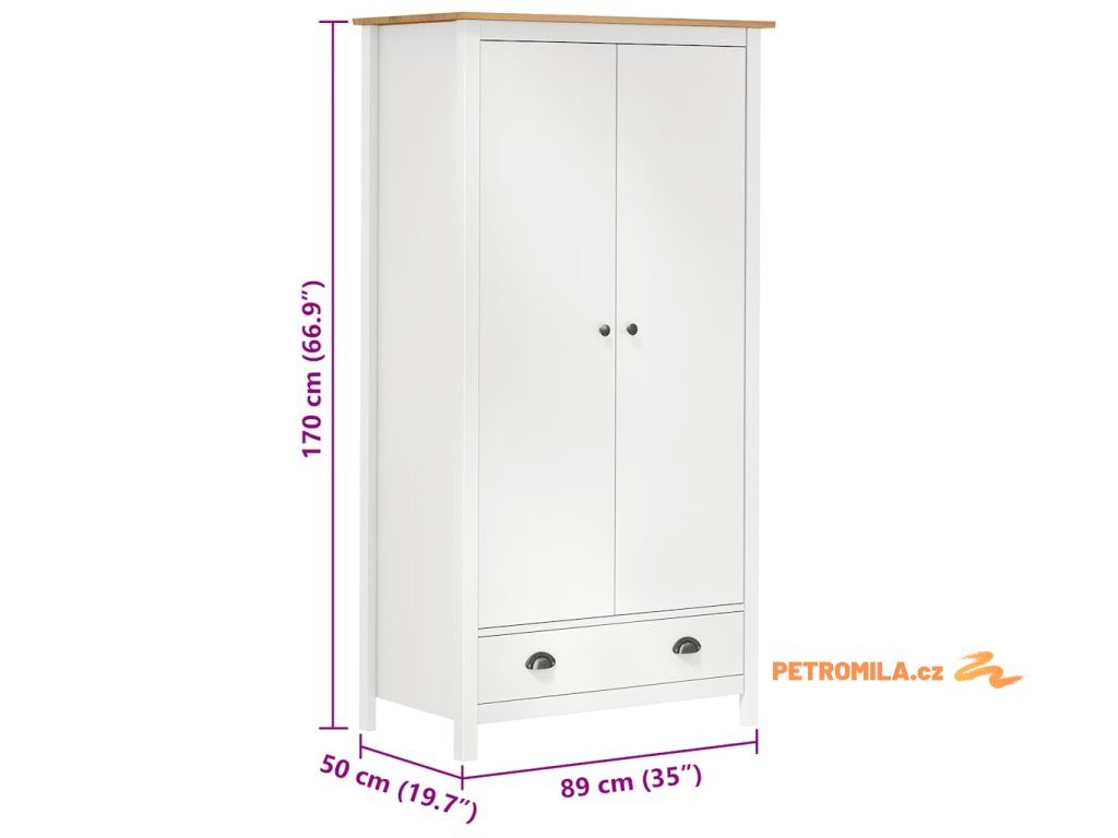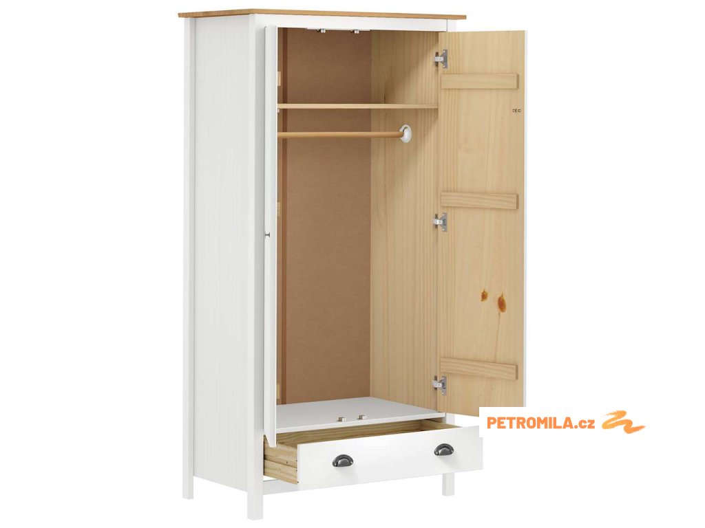 Šatní skříň je zhotovena z masivního borového dřeva, je tedy velmi robustní. Šatní skříň s 1 zásuvkou a 1 policí poskytuje dostatek prostoru pro přehledné uložení menších věcí na dosah ruky. Velká přihrádka je vybavena šatní tyčí, kterou můžete použít k zavěšení kabátů, šatů atd. Šatní skříň se snadno sestavuje.