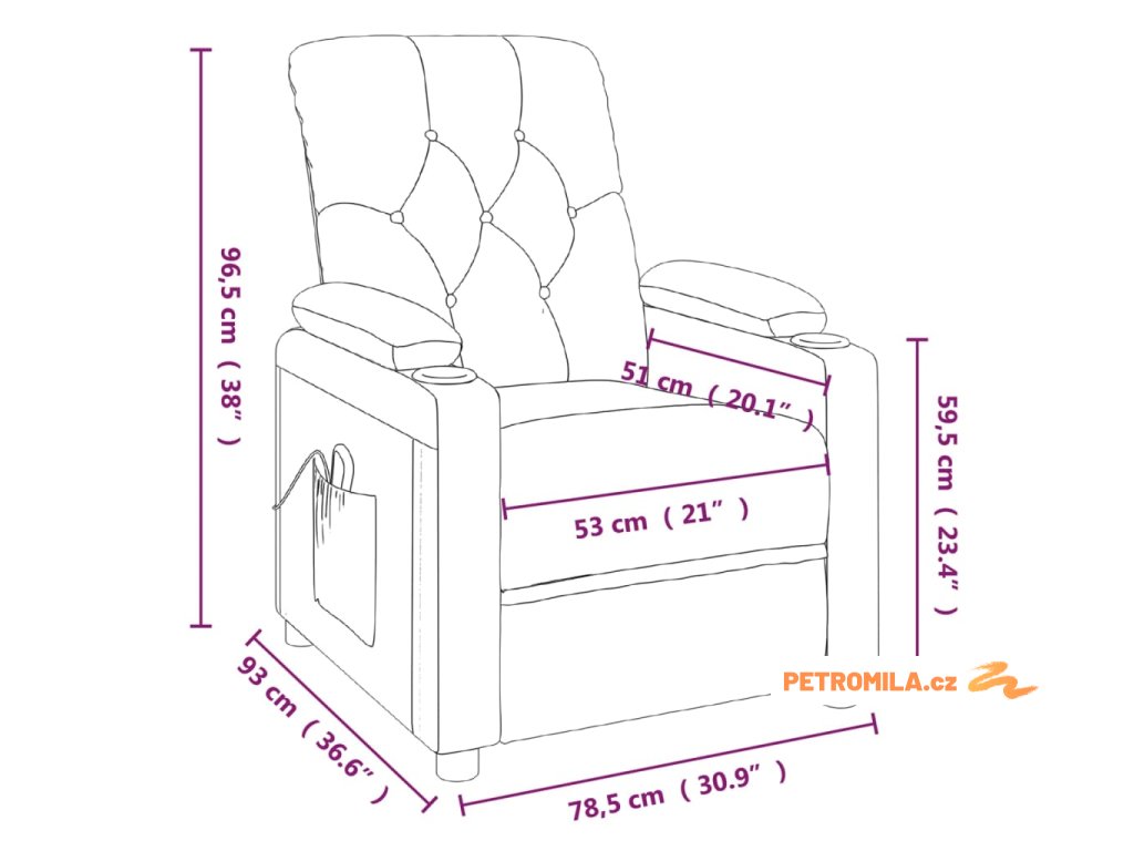 - Rozměry sklopeného křesla: 78,5 x 136,5 x 80,5 cm (Š x H x V)
