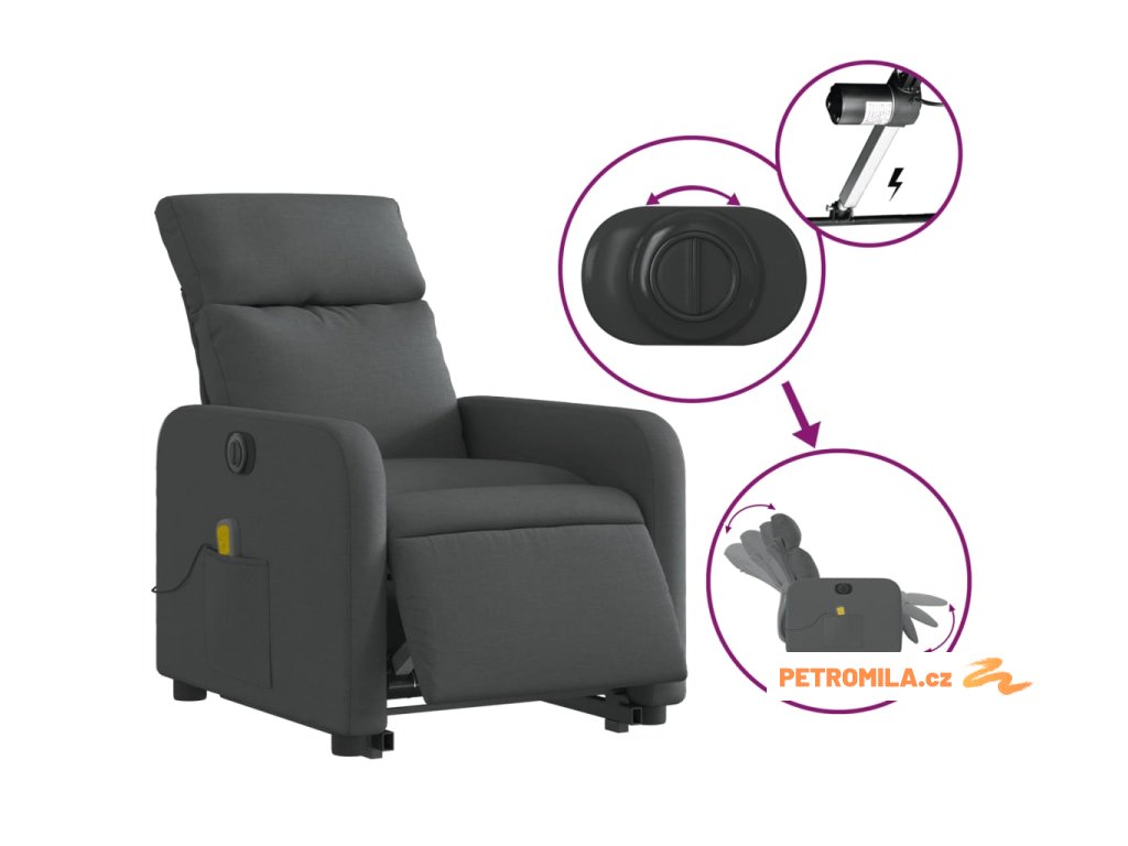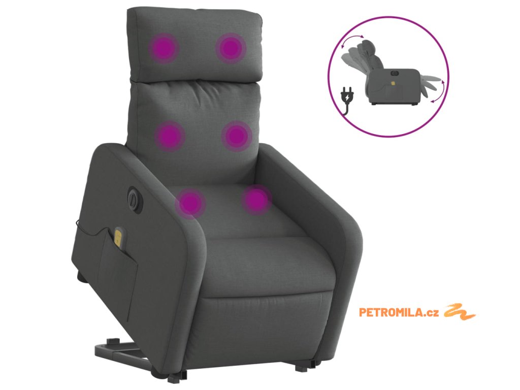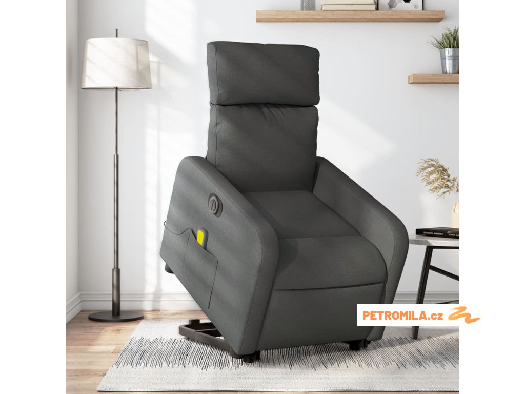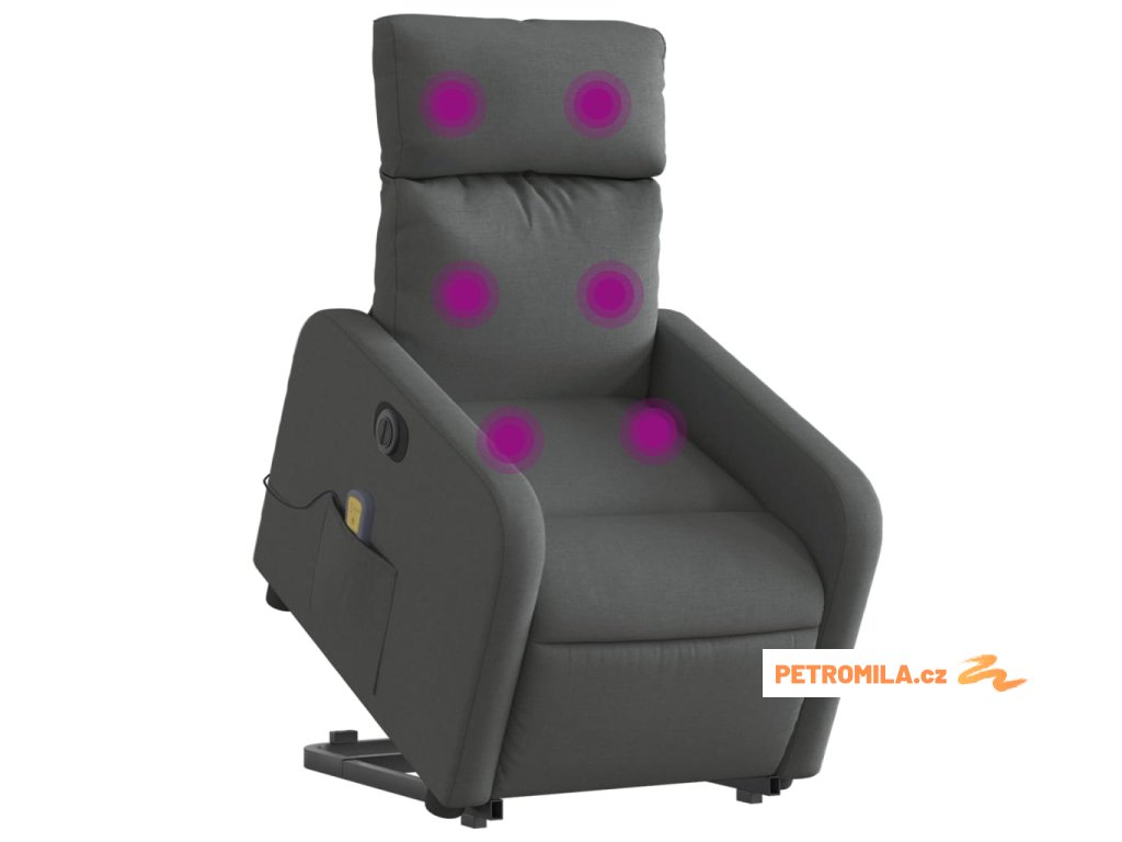 Elektrické zvedací masážní polohovací křeslo tmavě šedé textil