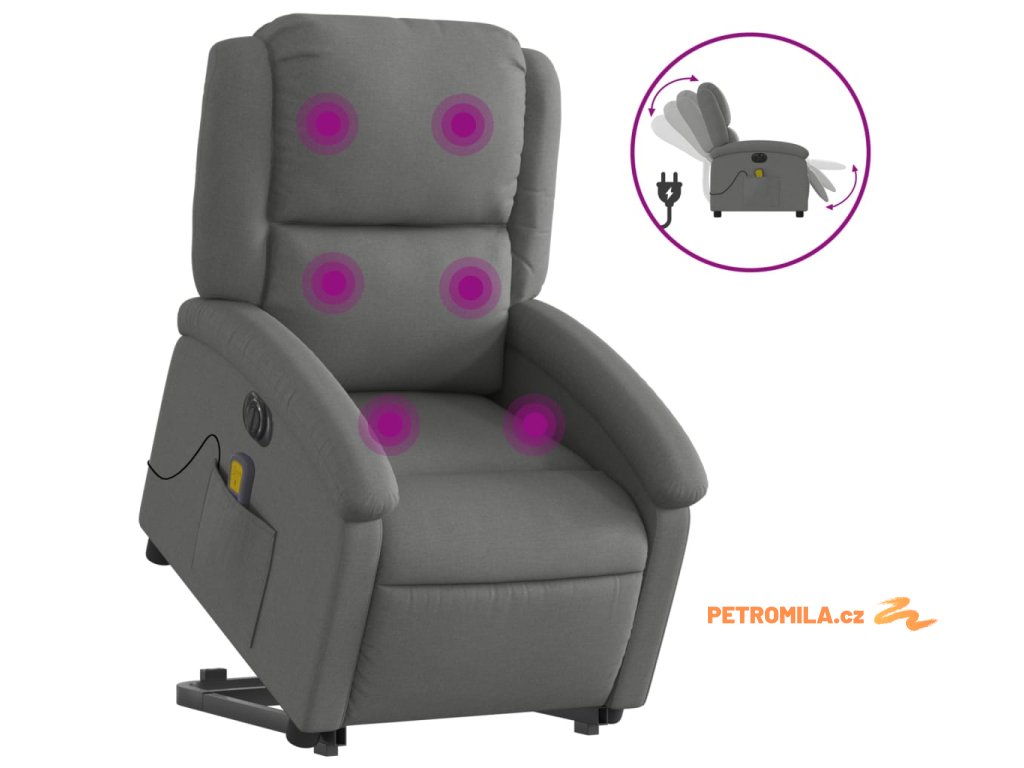 Elektrické zvedací masážní polohovací křeslo tmavě šedé textil