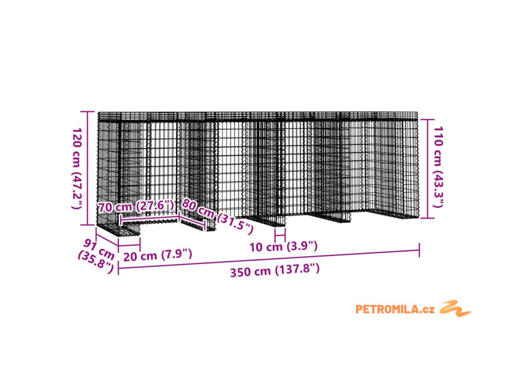Gabionová stěna na popelnice 350x91x120 cm pozinkované železo