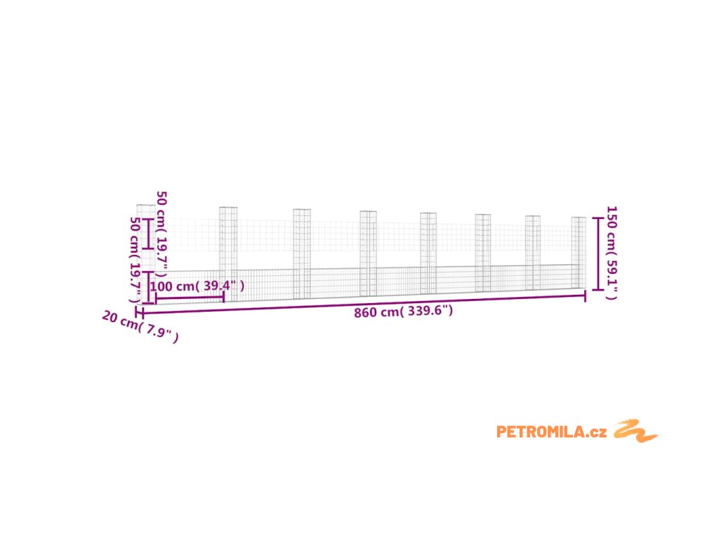 Gabionový koš ve tvaru U s 8 sloupky železo 860 x 20 x 150 cm