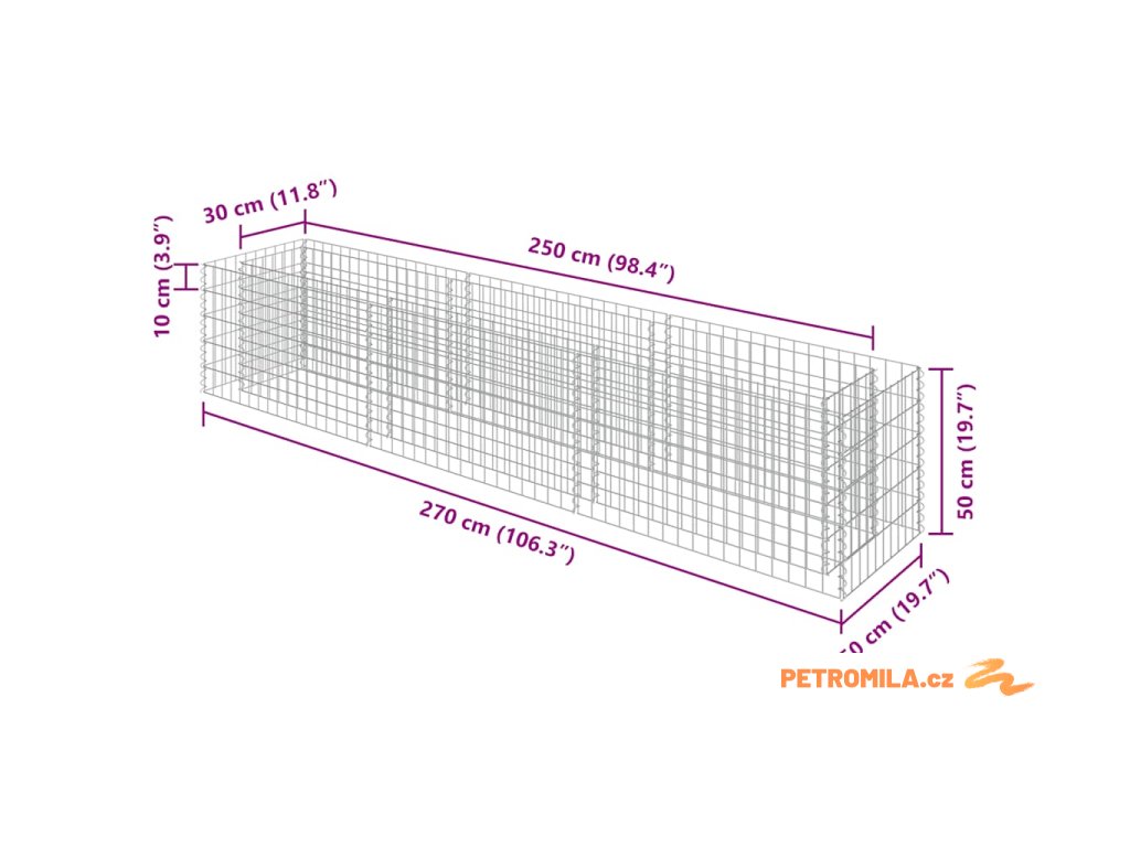 Gabionový vyvýšený záhon pozinkovaná ocel 270 x 50 x 50 cm