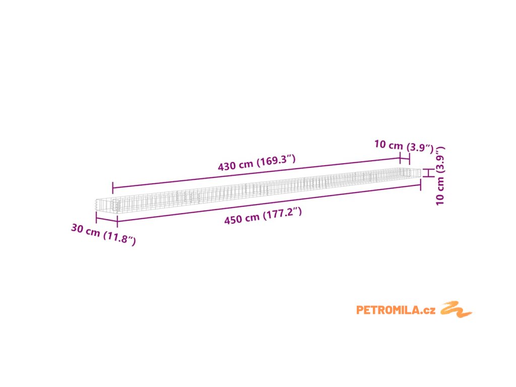 Gabionový vyvýšený záhon pozinkovaná ocel 450 x 30 x 10 cm