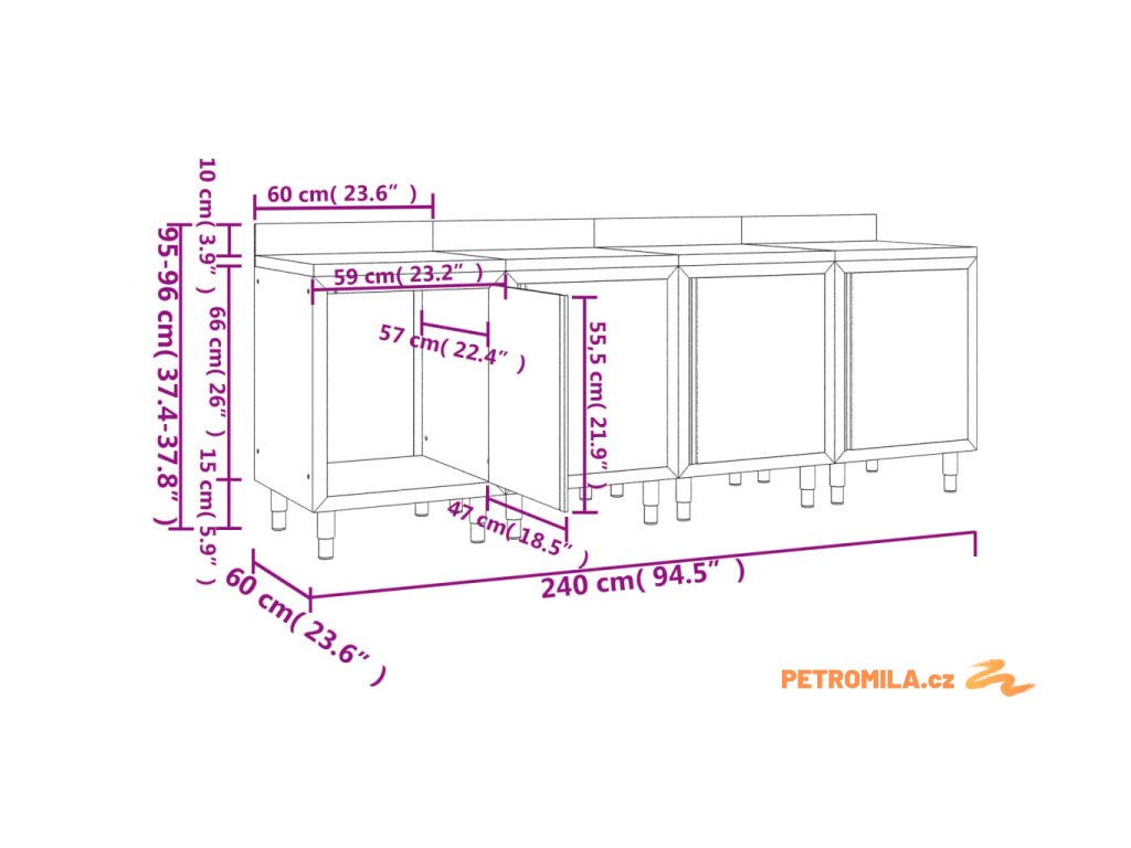 - Celkové rozměry: 240 x 60 x (95–96) cm (D x Š x V)