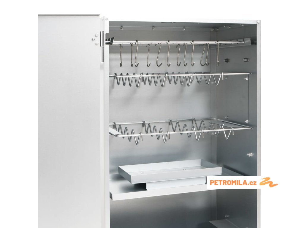- Dostatek prostoru na uzení: Venkovní udírna poskytuje dostatek prostoru pro uzení masa, ryb, klobás apod. Pomocí přiložených háků ve tvaru písmene S a roštů bude grilování pohodlnější.