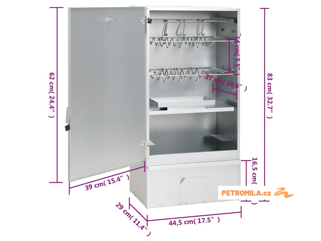 - Dostatek prostoru na uzení: Venkovní udírna poskytuje dostatek prostoru pro uzení masa, ryb, klobás apod. Pomocí přiložených háků ve tvaru písmene S a roštů bude grilování pohodlnější.