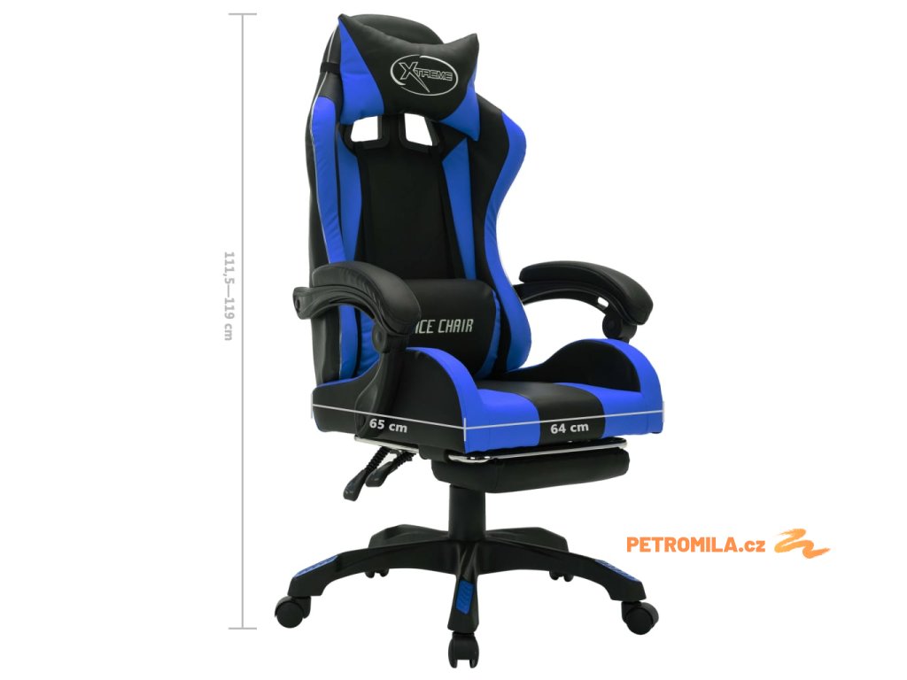 Tato herní židle je čalouněná umělou kůží, která se snadno čistí. Má sklopnou opěrku nohou, kterou lze sklopit pod sedák, kdykoli ji nepoužíváte. Součástí židle je také hustě polstrovaná opěrka hlavy a polštářek pod bedra, která vám nabídnou extra pohodlí pro každý náročný pracovní den. Kancelářská židle je vybavená plynovým zvedacím mechanismem, takže je výškově nastavitelná. Úhel sklopení je také nastavitelný, takže pokud máte pocit, že byste si chtěli zdřímnout, umístěte opěradlo do zcela sklopené polohy. Podvozek s pojezdovými kolečky s 360° otáčením usnadňuje pohyb po okolí. Okraj opěradel je vybaven LED světly poskytující lepší herní atmosféru. Pomocí dálkového ovladače můžete snadno měnit barvu a způsob blikání světel.