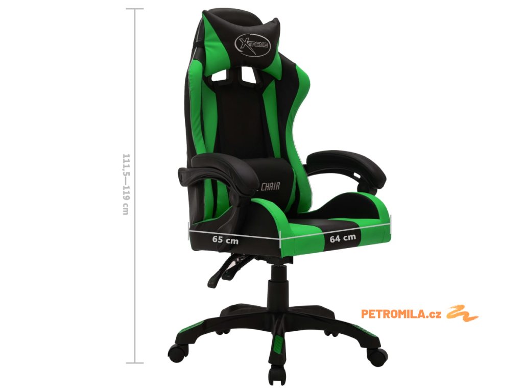 Herní židle je čalouněná umělou kůží, která se snadno čistí. Součástí je také hustě polstrovaná opěrka hlavy a polštářek pod bedra, jež vám během vašeho náročného pracovního dne zajistí mimořádné pohodlí. Kancelářská židle je vybavená mechanismem s plynovým pístem, takže lze upravovat její výšku. Stejně tak si můžete nastavit i úhel sklonu, pokud vás tedy přepadne chuť si na chvíli zdřímnout, stačí sklopit opěradlo do nejnižší polohy. Židle se navíc otáčí o 360° a má 5 pojezdových koleček, což usnadňuje její pohyb. Okraj opěradel je opatřen LED světly, která vám navodí lepší herní atmosféru. Pomocí dálkového ovladače můžete snadno měnit barvu a způsob blikání světel.