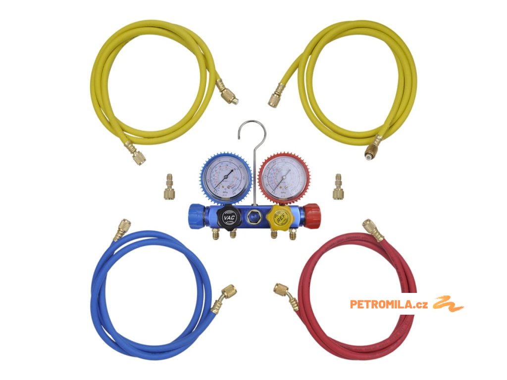 Čtyřcestná sada na měření se uplatní při plnění a kontrole klimatizačních systémů, ukáže vám totiž údaje o tlaku v systému. Můžete ji použít na všechny automobilové klimatizace, ale i komerční a domácí klimatizační chladicí systémy. Hodnoty na barevně rozlišených měřidlech lze číst snadno, rychle a přehledně. Aby se nepoškodila, jsou zapuštěná v ochranném plášti. Pomocí vestavěného ocelového háčku je také bez námahy zavěsíte. Sada na měření má odolnou konstrukci a pro jednoduchou přepravu a uskladnění je uložená v přenosném pouzdře z foukaného plastu.