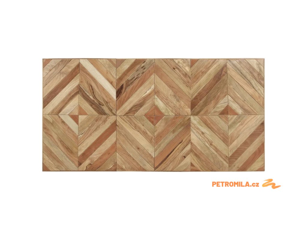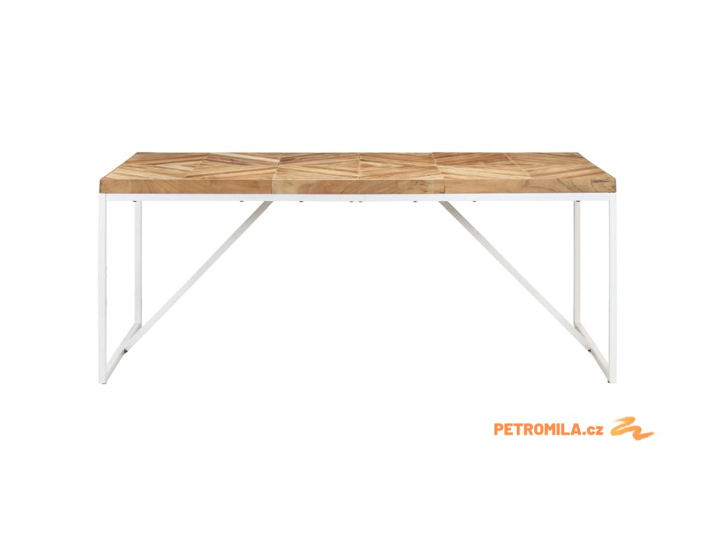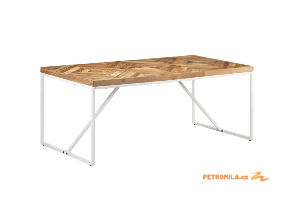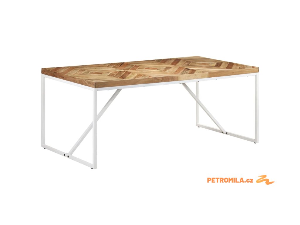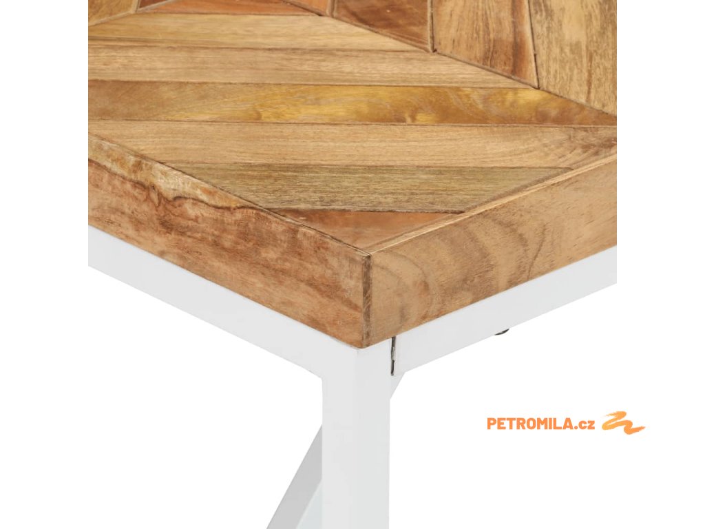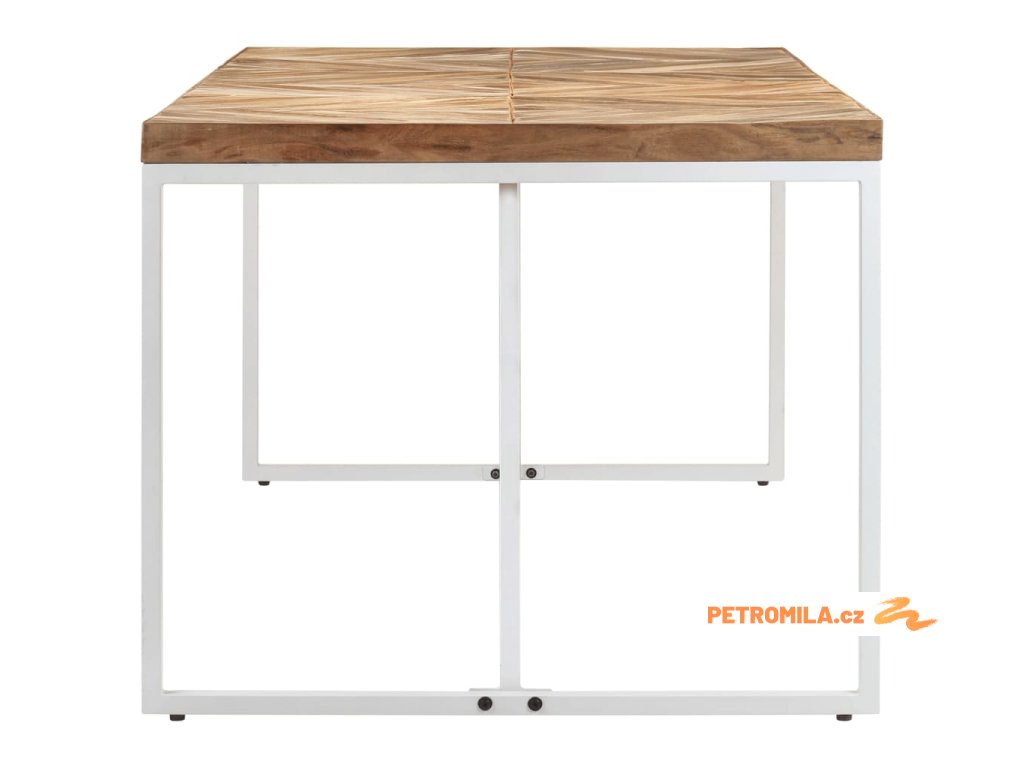 Jídelní stůl je ručně vyrobený z masivního akáciového a mangovníkového dřeva, je velmi stabilní a odolný. Bílé, práškově lakované ocelové nohy poskytují extra stabilitu. Robustní deska stolu má chevron a mozaikový design, který je velmi působivým doplňkem do vašeho interiéru. Je také perfektní pro servírování nápojů nebo občerstvení.