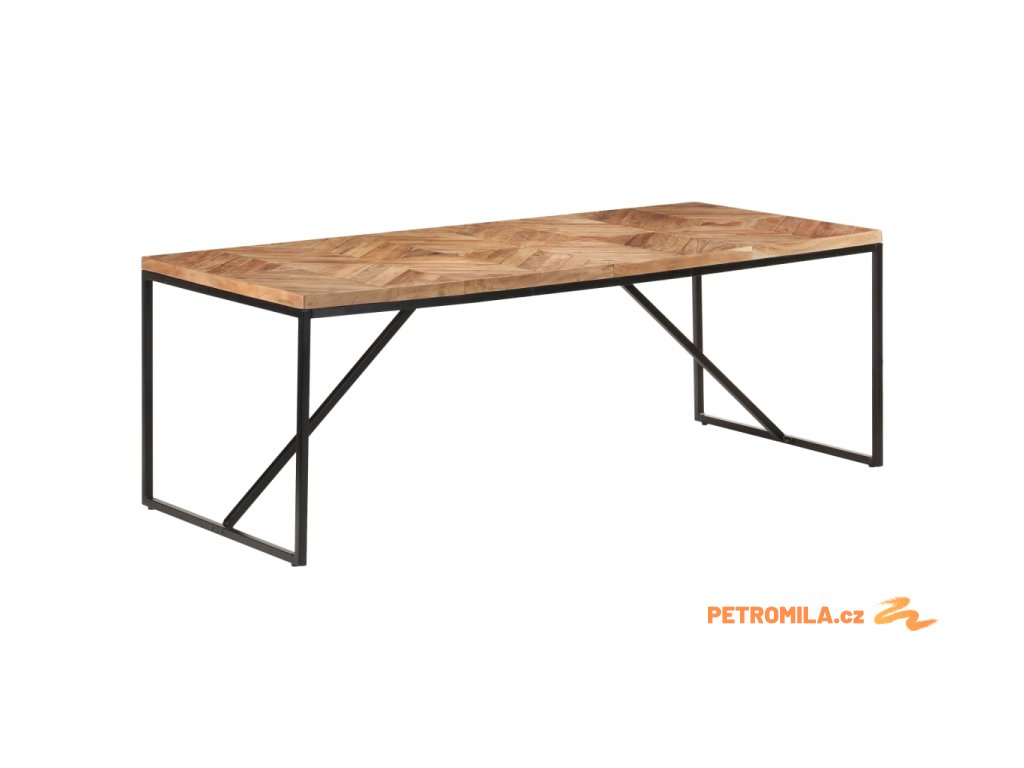 Jídelní stůl je ručně vyrobený z masivního akáciového a mangovníkového dřeva, je velmi stabilní a odolný. Černé práškově lakované ocelové nohy poskytují extra stabilitu. Robustní deska stolu má chevron a mozaikový design, který je velmi působivým doplňkem do vašeho interiéru. Je také perfektní pro servírování nápojů nebo občerstvení.