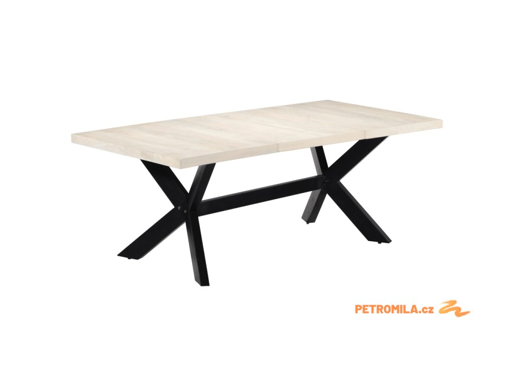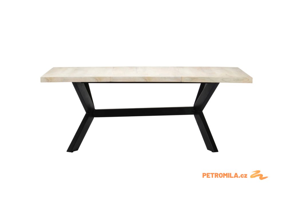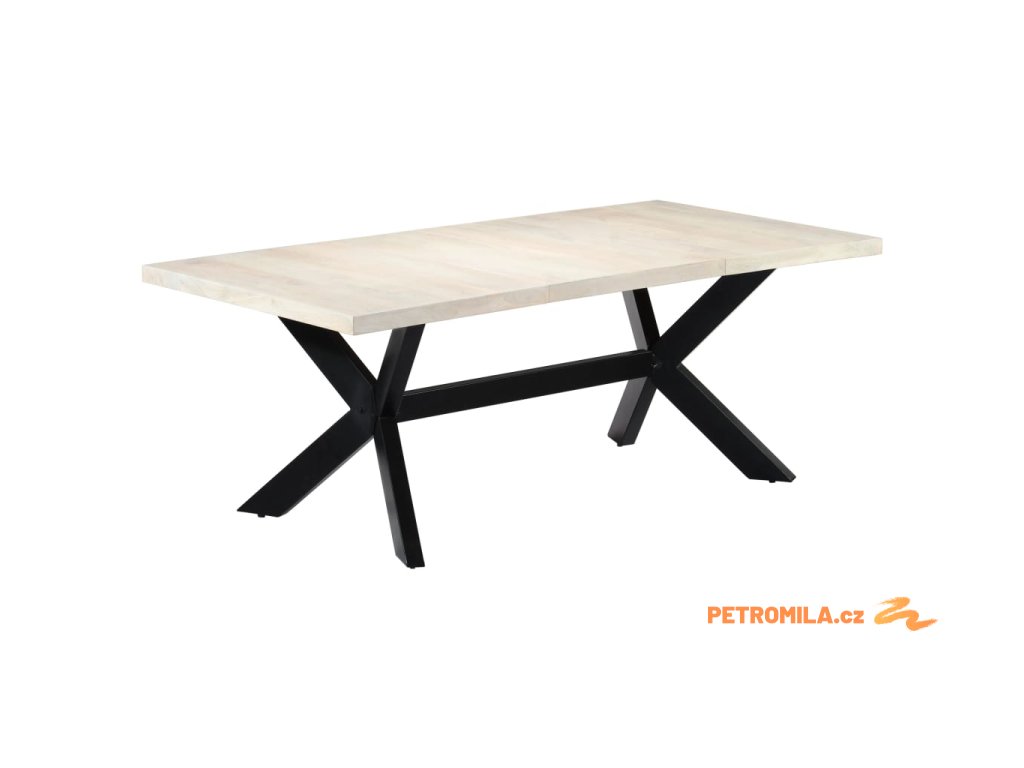 Jídelní stůl je vyroben z masivního mangovníku, což je husté a robustní tvrdé dřevo s povrchem, který se vyznačuje překrásnými hnědými nebo zlatými pruhy a liniemi. Stůl je celý ručně dělaný a každá fáze jeho výroby, včetně bělené povrchové úpravy, je prováděna s mimořádnou péčí. Celkový moderní vzhled stolu završují ocelové nohy, které spolu s ocelovým křížovým rámem přispívají k pevnosti konstrukce.