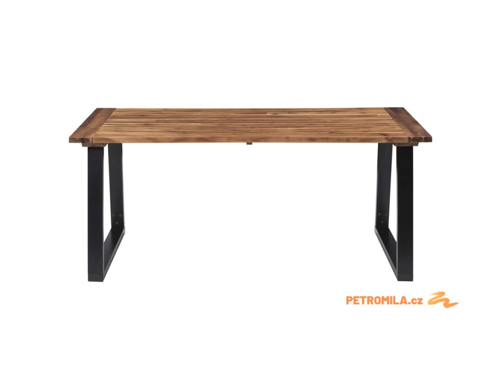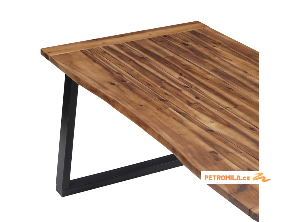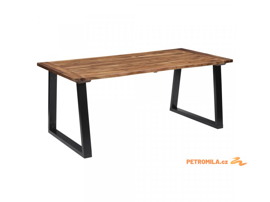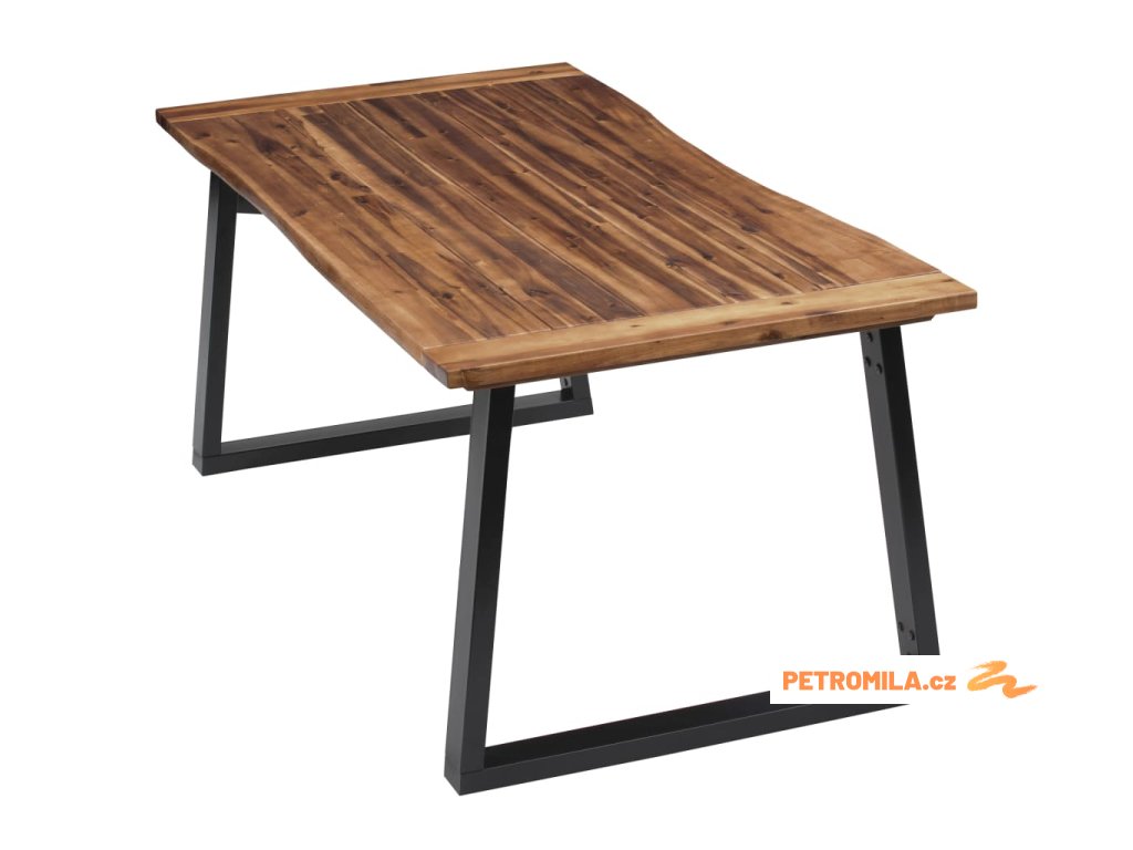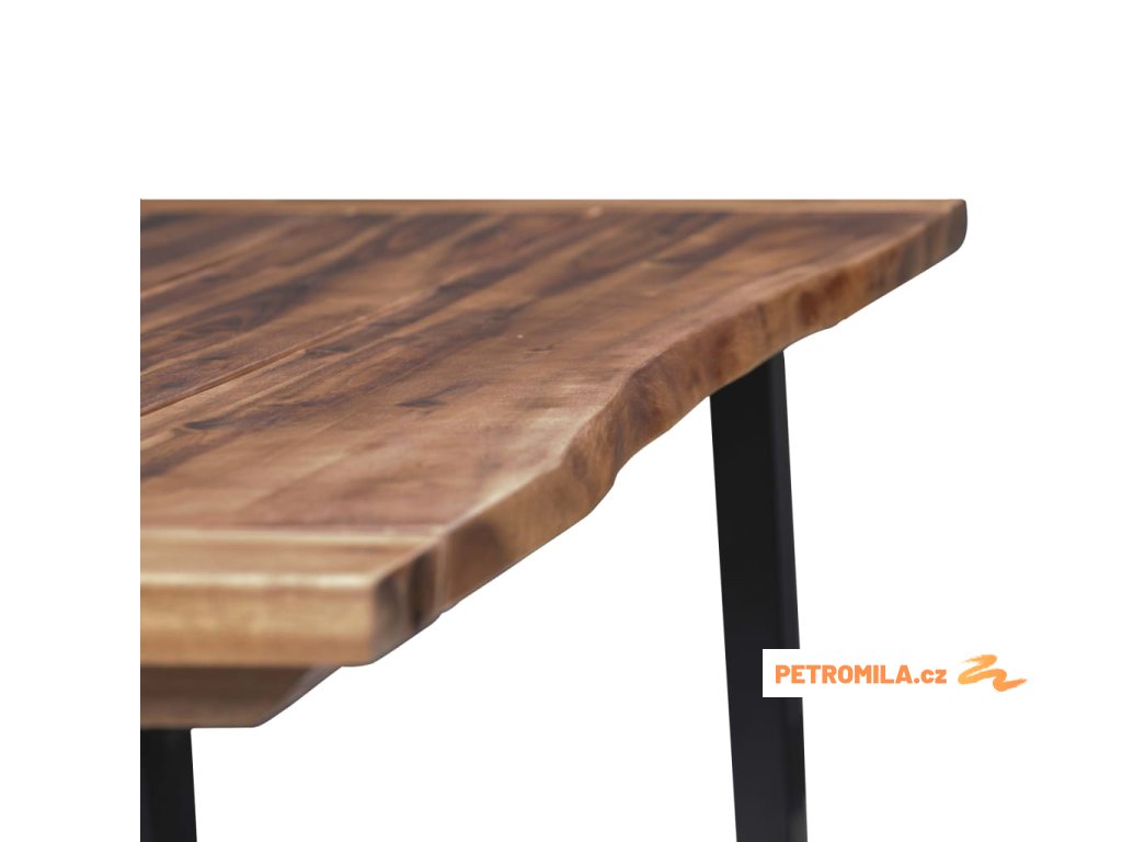Jídelní stůl je velmi robustní a odolný. Deska stolu je vyrobena z masivního akáciového dřeva, které je velmi trvanlivé. Nepravidelné hrany dřeva kopírují přirozený tvar stromu a zvyšují půvab stolu. Jedinečné kovové, práškovým nástřikem opatřené nohy ve tvaru písmene U umocňují industriální vzhled stolu a zajišťují jeho naprostou stabilitu.