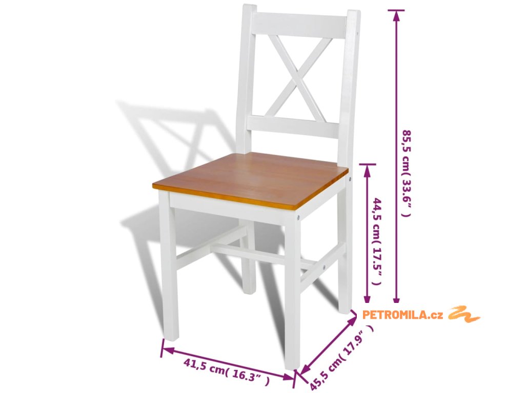 Tento set jídelních židlí s jednoduchým, ale elegantním designem se skládá z 4 kusů a bude skvělým přírůstkem do vaší jídelny nebo kuchyně. Židle jsou vyrobeny z masivního borového dřeva, což jim dodává stabilitu a trvanlivost. Jídelní židle se díky hladké povrchové úpravě snadno čistí. Jsou ergonomicky tvarované pro větší pohodlí při sezení. Balení obsahuje 4 jídelní židle.