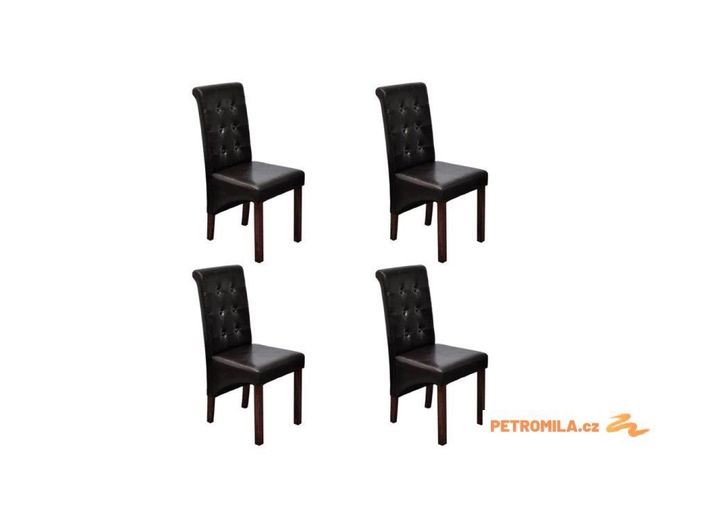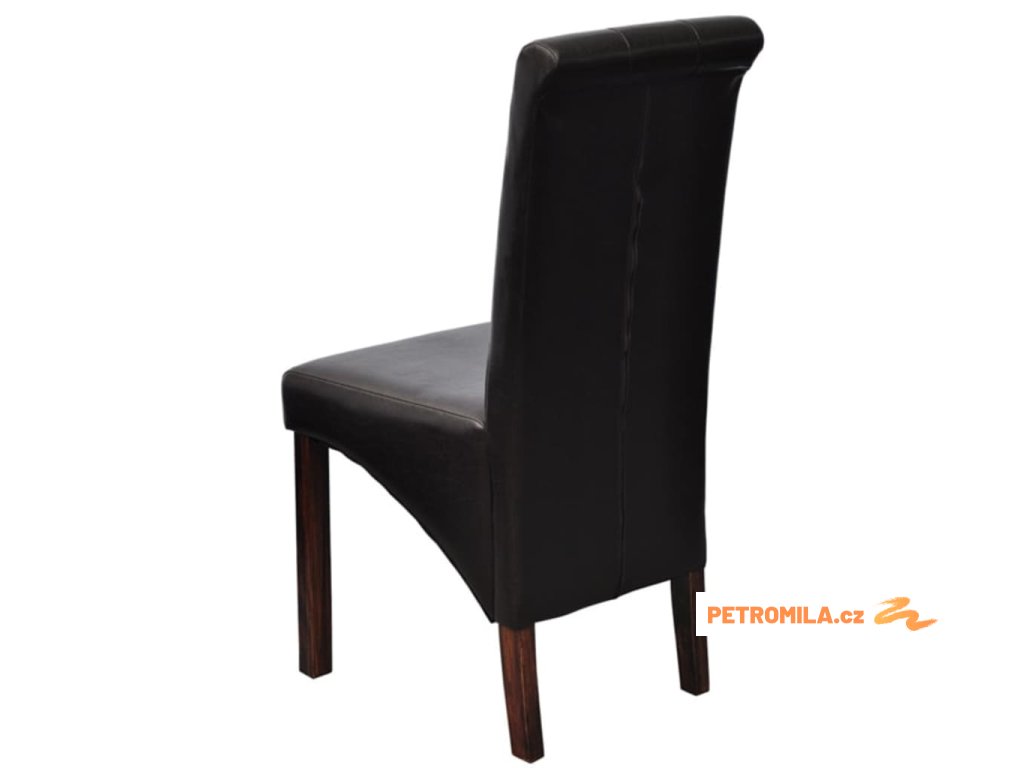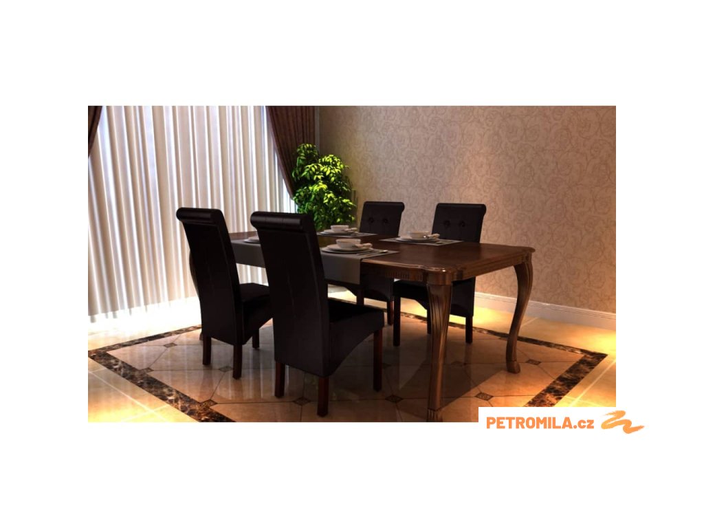 Tento set 4 pohodlných a širokých jídelních židlí má rustikální design s ergonomicky tvarovanými sedadly a opěradly. Nohy jsou vyrobené z masivního dřeva s tmavě hnědou lazurou. Jejich rohy jsou pro větší bezpečnost zaoblené. Údržba a čištění jsou velmi snadné. Sedadla a opěradla těchto jídelních židlí jsou polstrovaná odolnou syntetickou kůží.