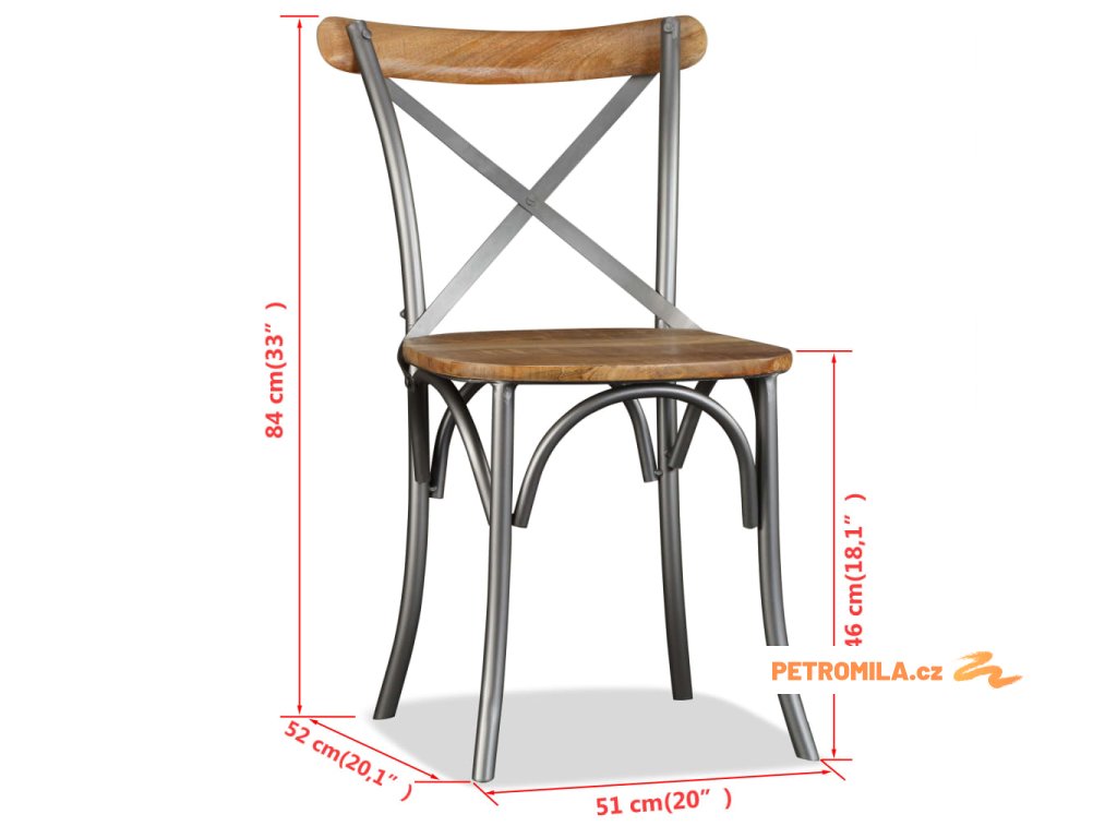 Sedadla a opěradla jsou vyrobena z masivního mangovníkového dřeva. Krásné dřevěné zrno dodává rustikální kouzlo a dělá každou z našich židlí jedinečnou a trochu odlišnou od další. Robustní ocelové rámy nejen dělají židle extrémně robustní a odolné, ale také doplňují průmyslový vzhled.