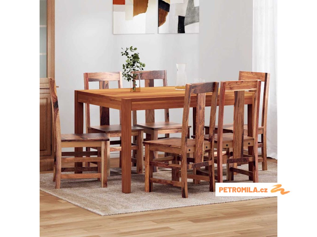 Tato sada 6 dřevěných jídelních židlí s nadčasovým designem vnese do vašeho domova nádech rustikálního kouzla. Tyto židle jsou vyrobeny z masivního dřeva s matnou povrchovou úpravou v medovém odstínu, jsou proto odolné a snadno se udržují. Překrásná struktura dřeva činí každou z našich židlí jedinečnou a lehce odlišnou od ostatních.