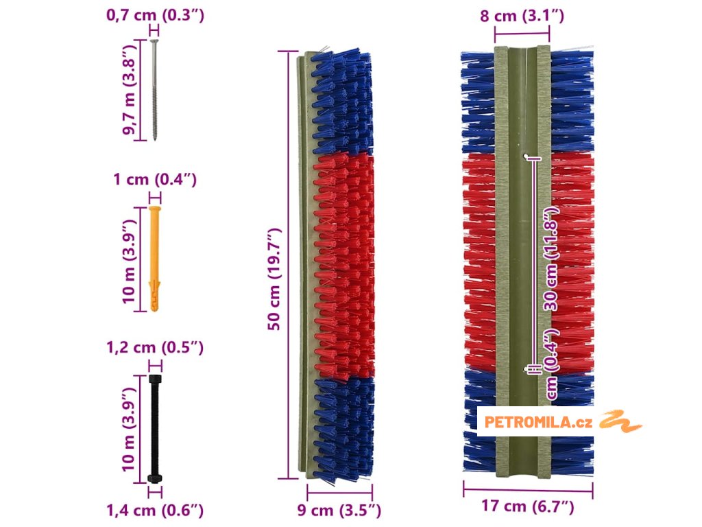 - Materiál konstrukce: U tohoto kartáče se můžeš spolehnout na prvotřídní plast a pevnou ocel, které zvládnou venkovní podmínky. Je navržený tak, aby odolával častému užívání a drsnému počasí, takže ti vydrží. Kombinace plastu a oceli dodává robustní konstrukci, která zvládne i velká zvířata.