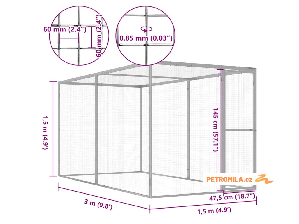 Klec pro kočky 3 x 1,5 x 1,5 m pozinkovaná ocel