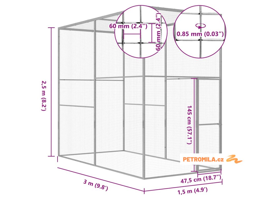 Klec pro kočky 3 x 1,5 x 2,5 m pozinkovaná ocel