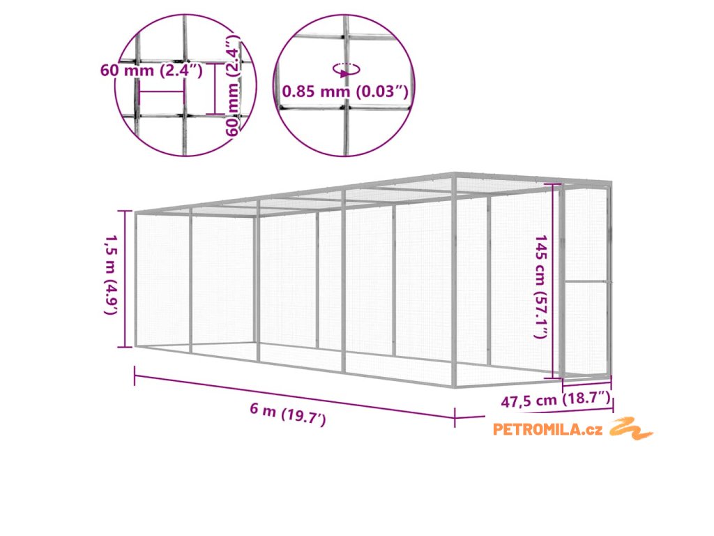 Klec pro kočky 6 x 1,5 x 1,5 m pozinkovaná ocel