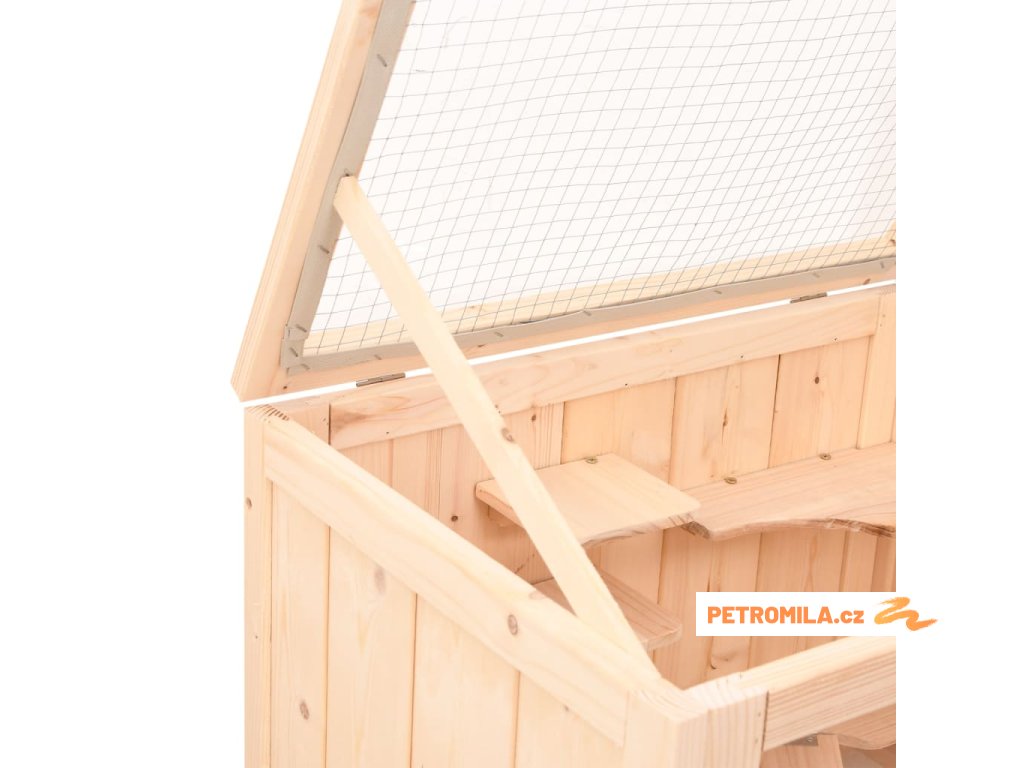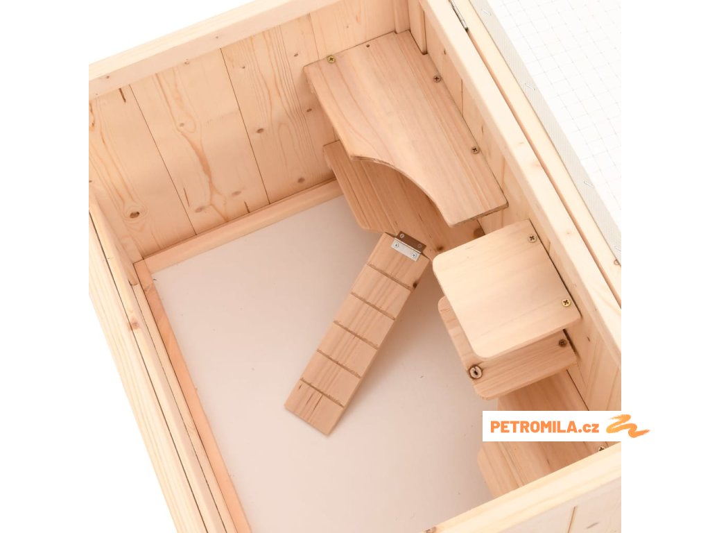 - Prostorný domek: Prostorná hlavní klec má dvě úrovně spojené vnitřním žebříkem, což poskytuje dostatek prostoru pro hraní a relaxaci.
