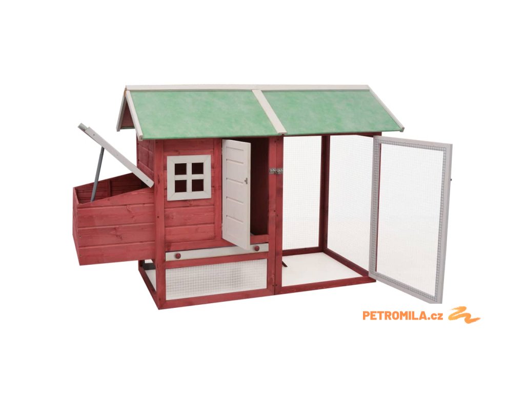Pletivová konstrukce z železných drátů vám umožní kuřata neustále sledovat a zajistí v kleci volné proudění čerstvého vzduchu. Kurník tvoří vysoce kvalitní dřevěný rám, který vám bude sloužit po dlouhá léta. Zelená střecha chrání obyvatele před deštěm a v útulném domečku se krásně vyspí. Ze spodního do horního patra vede rampa, po níž mohou zvířata snadno vyšplhat nahoru. Výsuvné dno klece usnadňuje její čištění. Dvířka lze jednoduše zavřít a zajistit zasouvacími západkami.