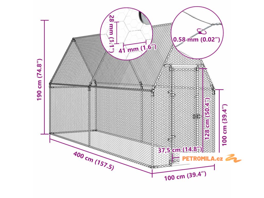 Klec pro kuřata stříbrná 400 x 100 x 190 cm pozinkovaná ocel