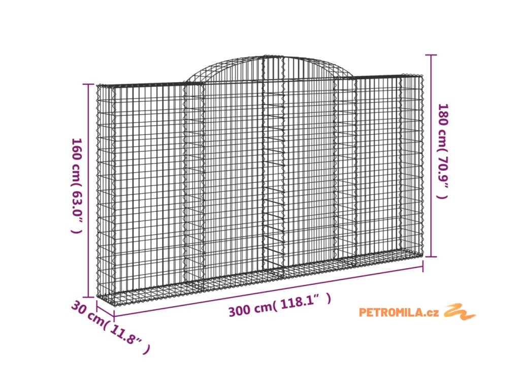 Klenutý gabionový koš 300 x 30 x 160/180 cm pozinkované železo