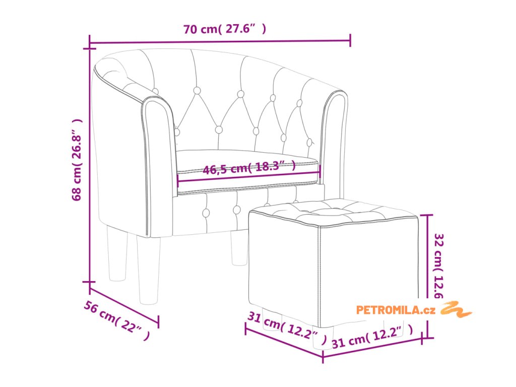 - Rozměry klubového křesla: 70 x 56 x 68 cm (Š x H x V)