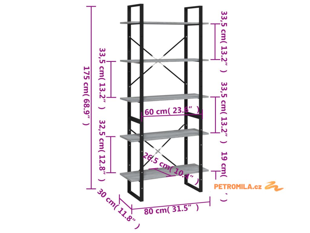 Knihovna s 5 policemi šedá sonoma 80x30x175 cm kompozitní dřevo