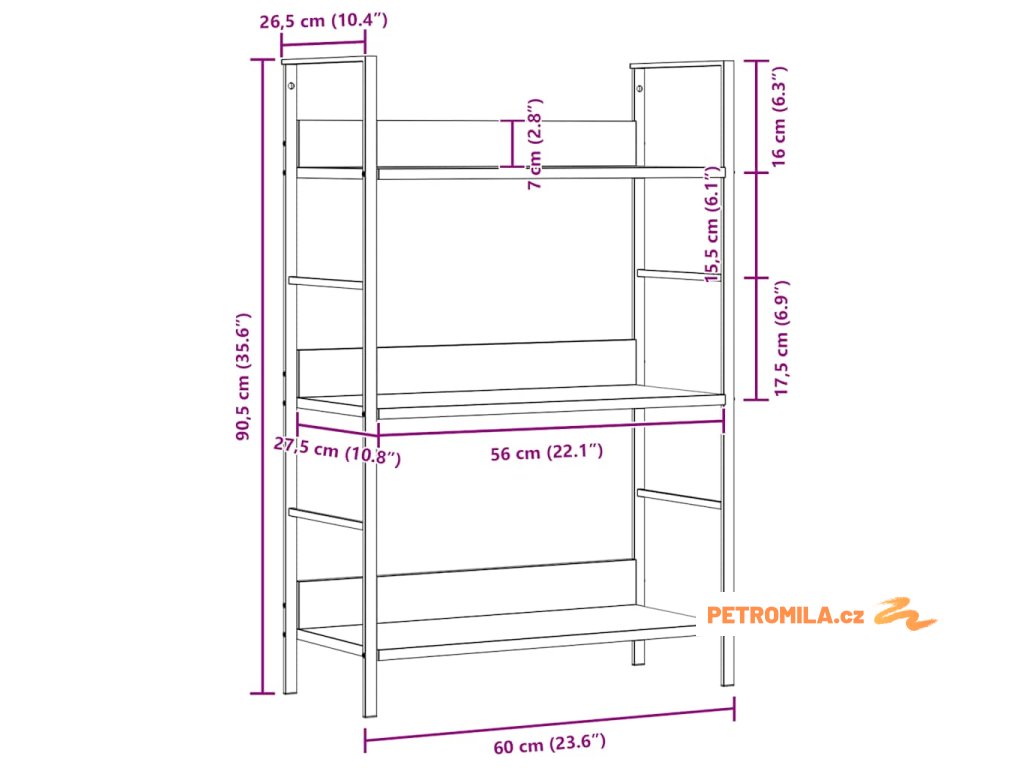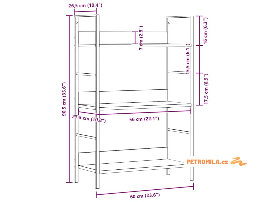 - Rozměry jedné vodorovné police: 56 x 27,6 x 1,5 cm (D x Š x V)