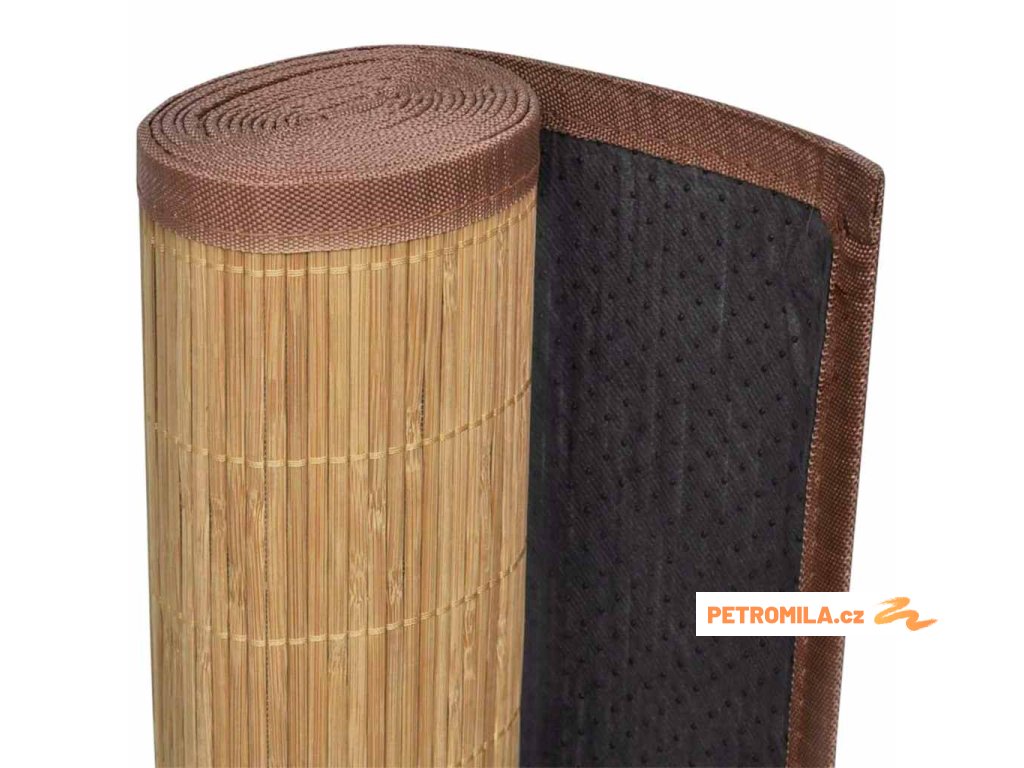 Spodní strana bambusového koberce je podložená neklouzavou PVC vrstvou, která poskytuje nejen vynikající tlumení, ale navíc udržuje koberec na místě. Polypropylenové okraje dodávají bambusové rohoži pečlivě dokončený vzhled. Koberec je vyrobený z přírodního pevného bambusu a snadno se čistí.