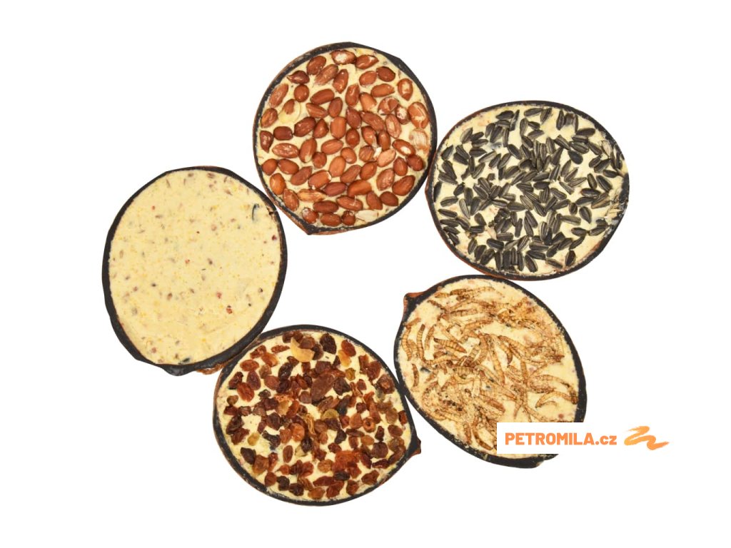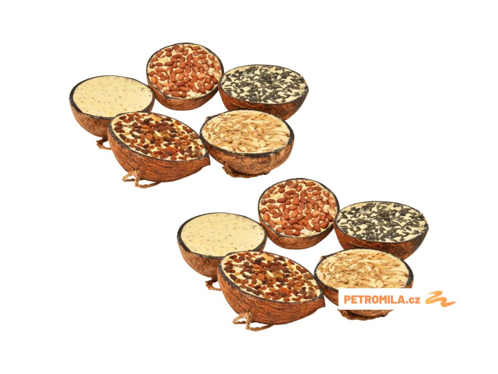 Těchto 10 půlek kokosového ořechu je naplněných směsí ptačího krmiva v 5 různých variantách. Volně žijící ptáčci v nich najdou prémiovou směs tuku a proteinů, která jim dodá potřebnou extra dávku energie.