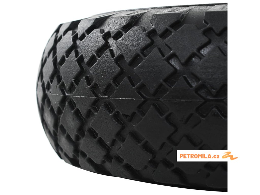- Materiál: masivní PU (polyuretanová) elastomerová pneumatika a plastový ráfek