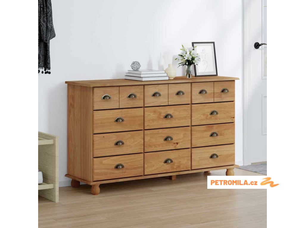 - Masivní borová konstrukce – Tato komoda je z prvotřídního masivního borového dřeva, takže je fakt silná a odolná. Není to jen o síle, ale taky vypadá skvěle a dodává místnosti elegantní nádech díky své přirozené textuře.