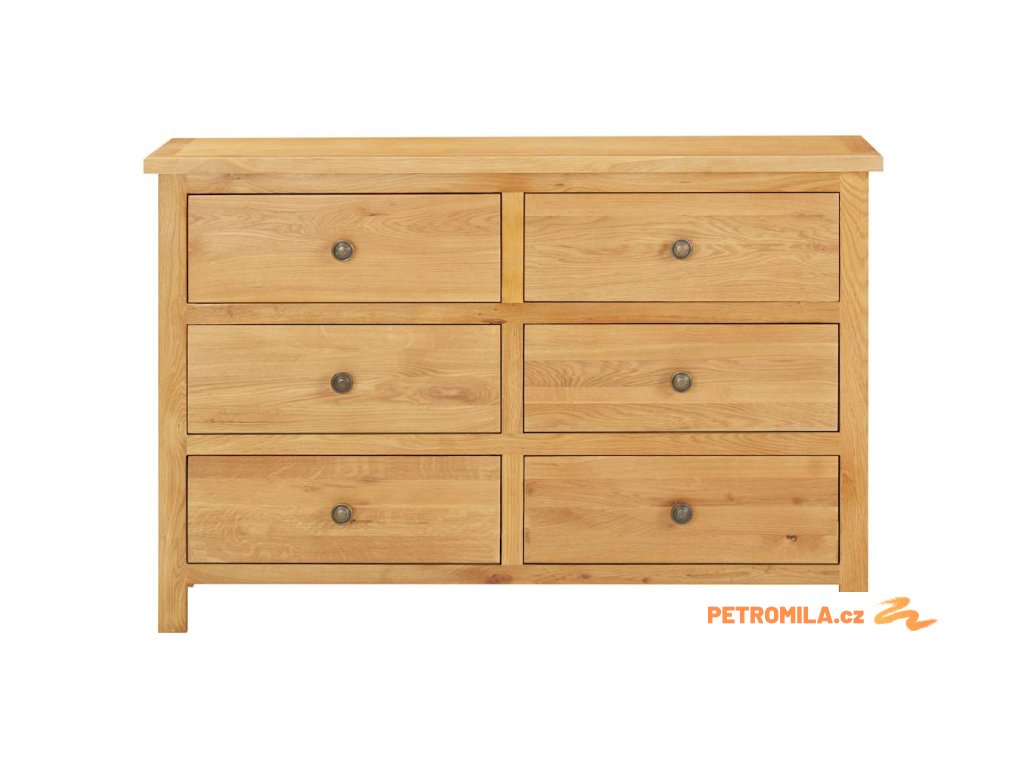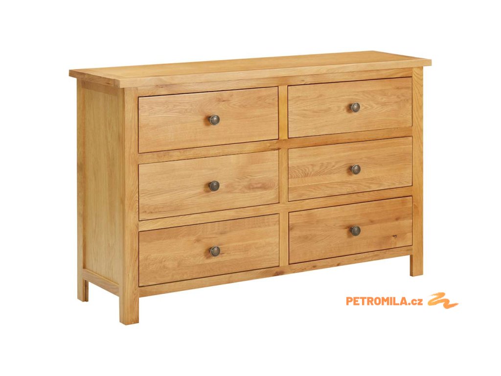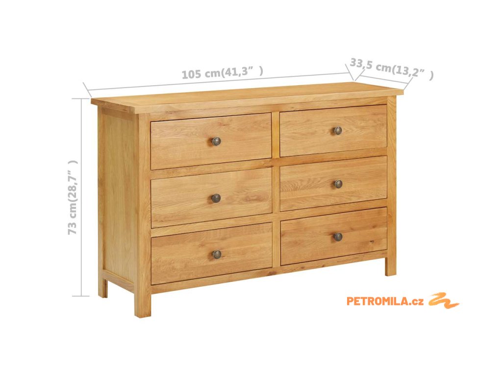 Komoda se zásuvkami je vyrobená z masivního dubového dřeva s přírodním povrchem. Pokud chcete prodloužit životnost dřeva, doporučujeme ho ošetřit dubovým olejem nebo jiným prostředkem na vodní bázi. Stabilní horní deska komody vám nabídne dostatek prostoru pro odkládání nápojů či pro mísu s ovocem a dekorativní předměty atd. Má také šest zásuvek, které nabízejí dostatek úložného prostoru pro vaše oblečení a malé předměty.
