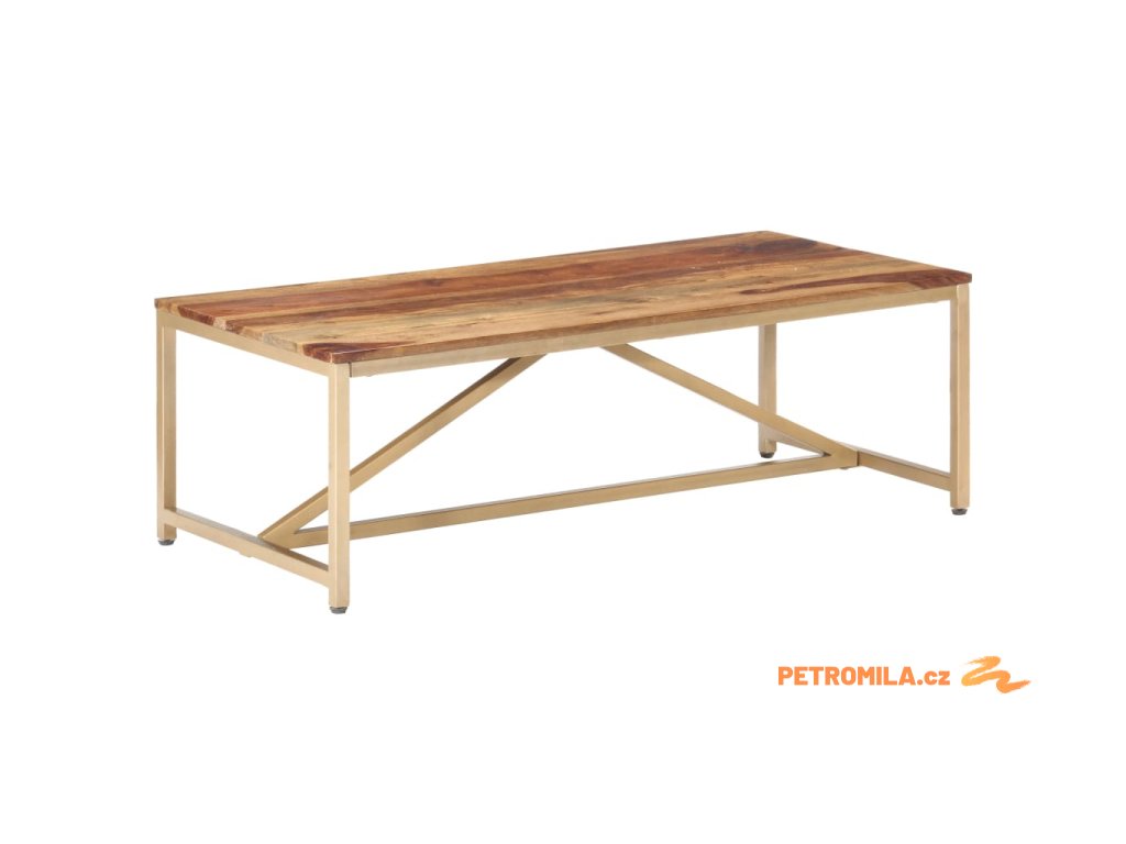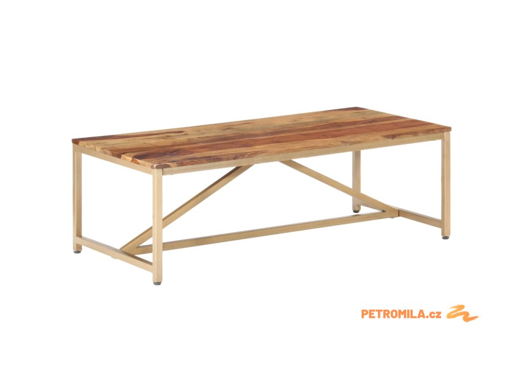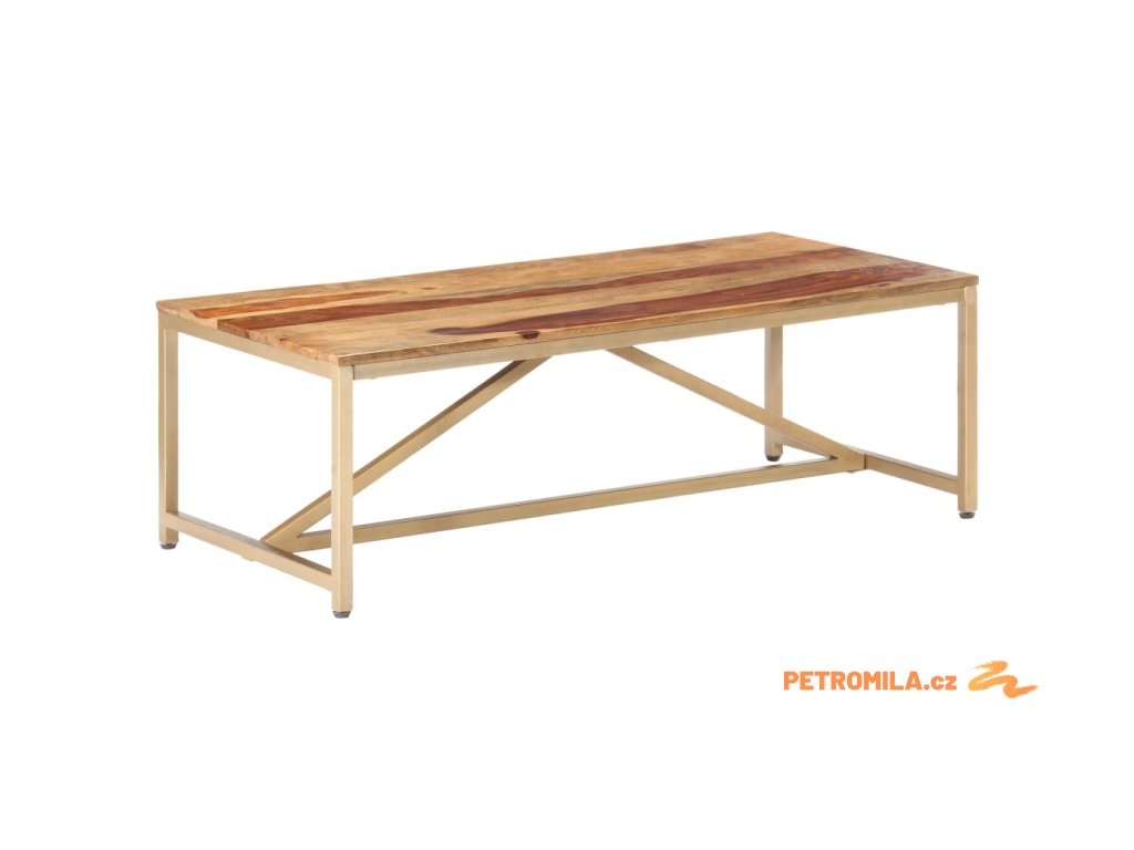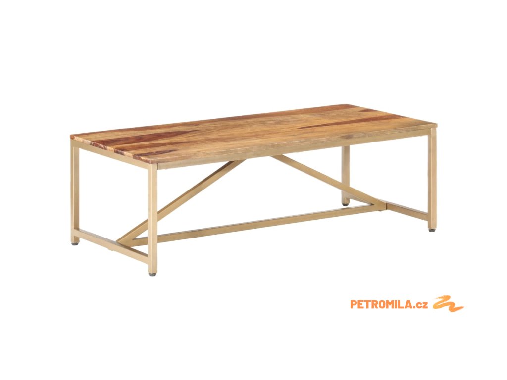 Tento praktický konferenční stolek je vyroben z masivního dřeva a lze jej použít také jako odkládací stolek, přístavný stolek nebo stolek k pohovce. Řemeslné zpracování a krásná kresba dřeva dává každému kusu nábytku jeho jedinečný a od všech ostatních mírně odlišný charakter. Jeho masivní horní deska poskytuje stabilní a bezpečný povrch pro servírování nápojů nebo pro vystavení váz, mís s ovocem či jiných dekorací. Ke stabilitě přispívá také mosazná ocel s práškovým nástřikem. Tento dřevěný stolek se snadno sestavuje.