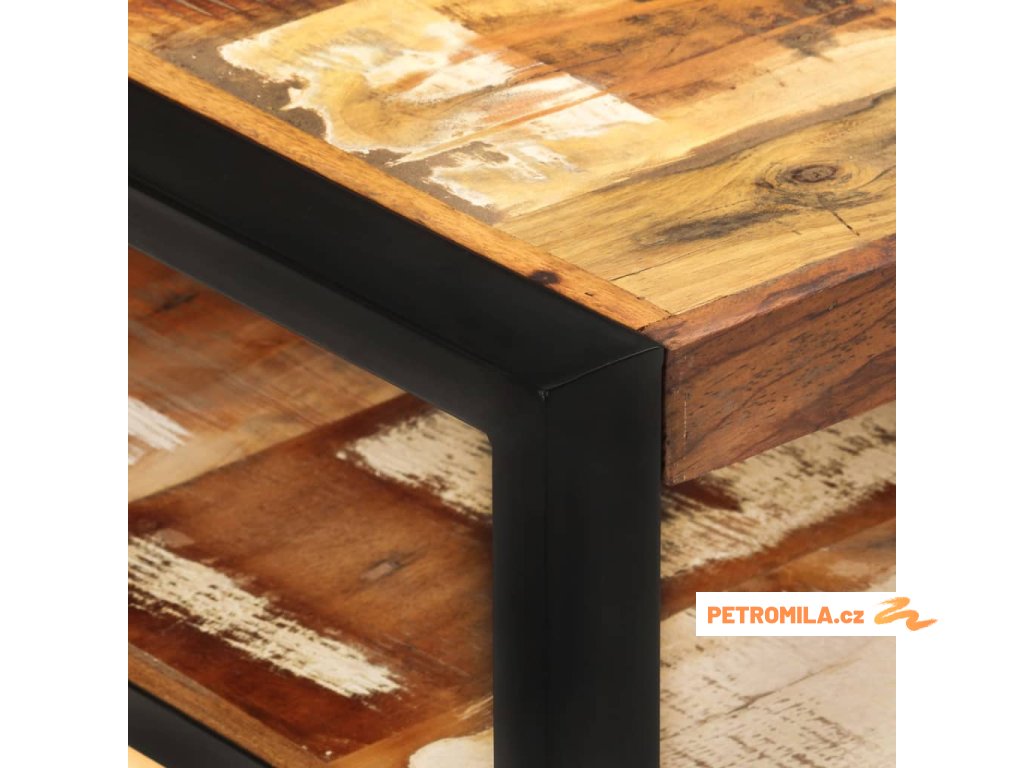 Tento konferenční stolek je vyroben z masivního recyklovaného dřeva, které pochází z trámů, nosných trámů a podlah ze starých a zbouraných budov. Jedná se tedy o ekologicky šetrný způsob výroby nábytku. Jde se o směs regenerovaného dřeva, které zahrnuje borovici, teak, buk, mangovník atd. To znamená, že regenerovaný materiál si zachovává vlastnosti těchto různých druhů dřeva. Železný rám s práškovým nástřikem dodává nábytku větší stabilitu. Tento praktický akcentový stolek má 2 vrstvy, které poskytují dostatek prostoru pro umístění multimediálních přístrojů, knih, časopisů nebo drobných předmětů, které chcete mít na dosah. Můžete si na něj také odložit nápoje, vystavit vázy, mísy s ovocem a další ozdoby.