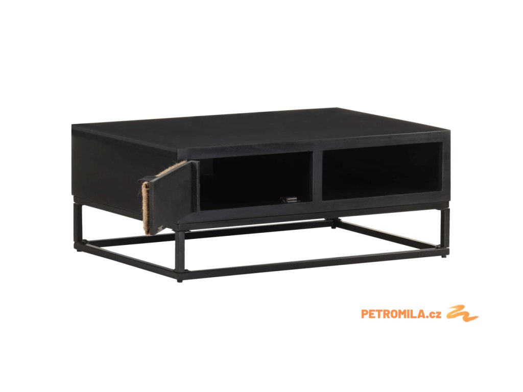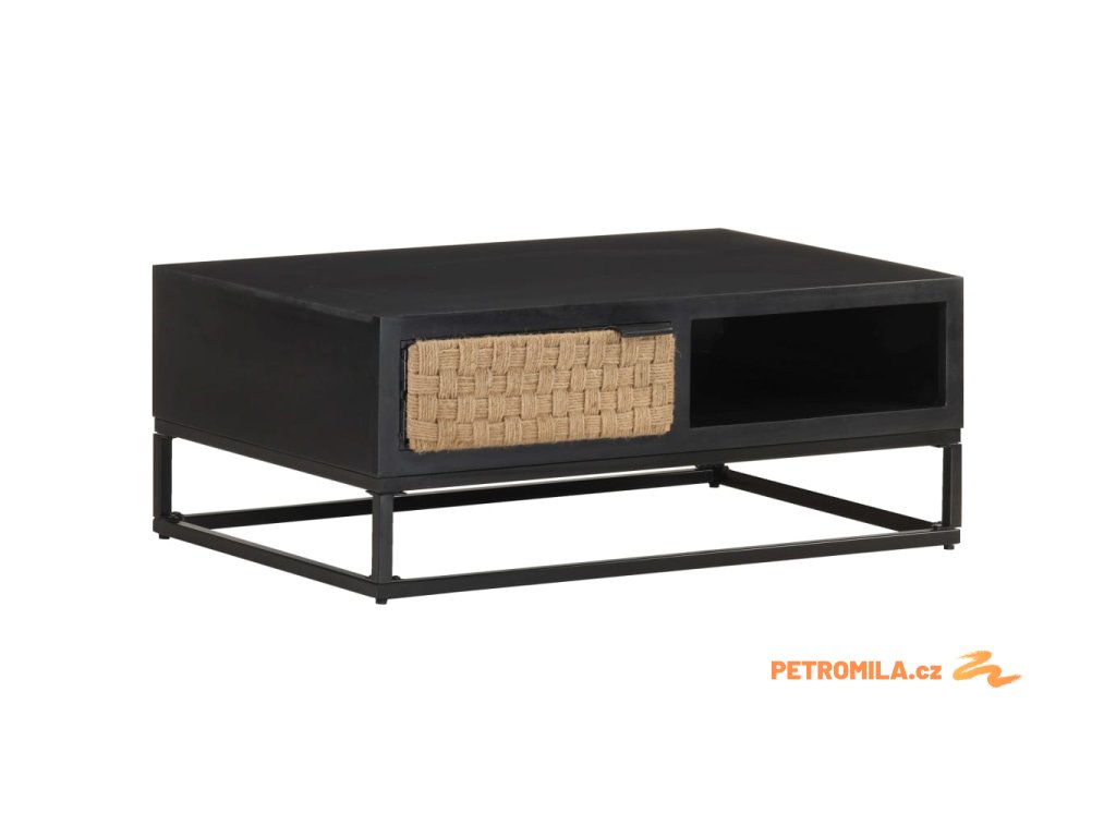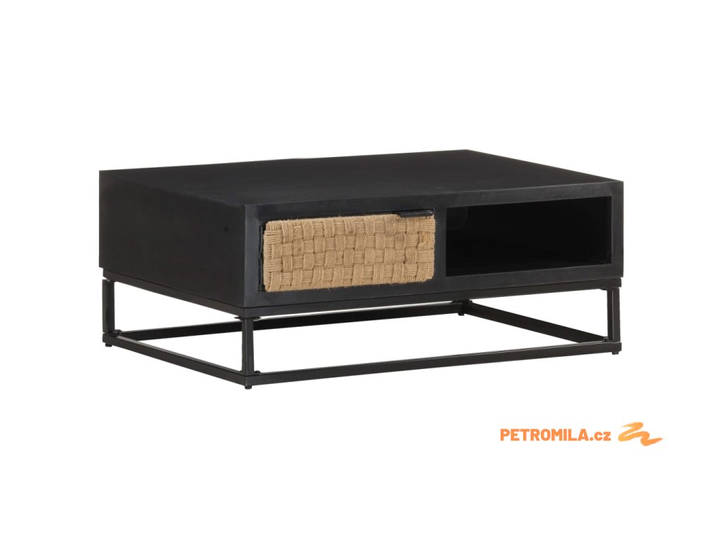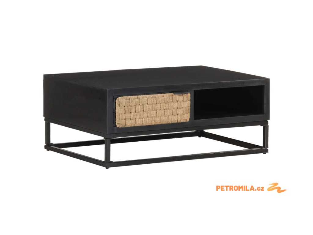 - Materiál: masivní mangovníkové dřevo s černou povrchovou úpravou, černě práškově lakované železo, juta
